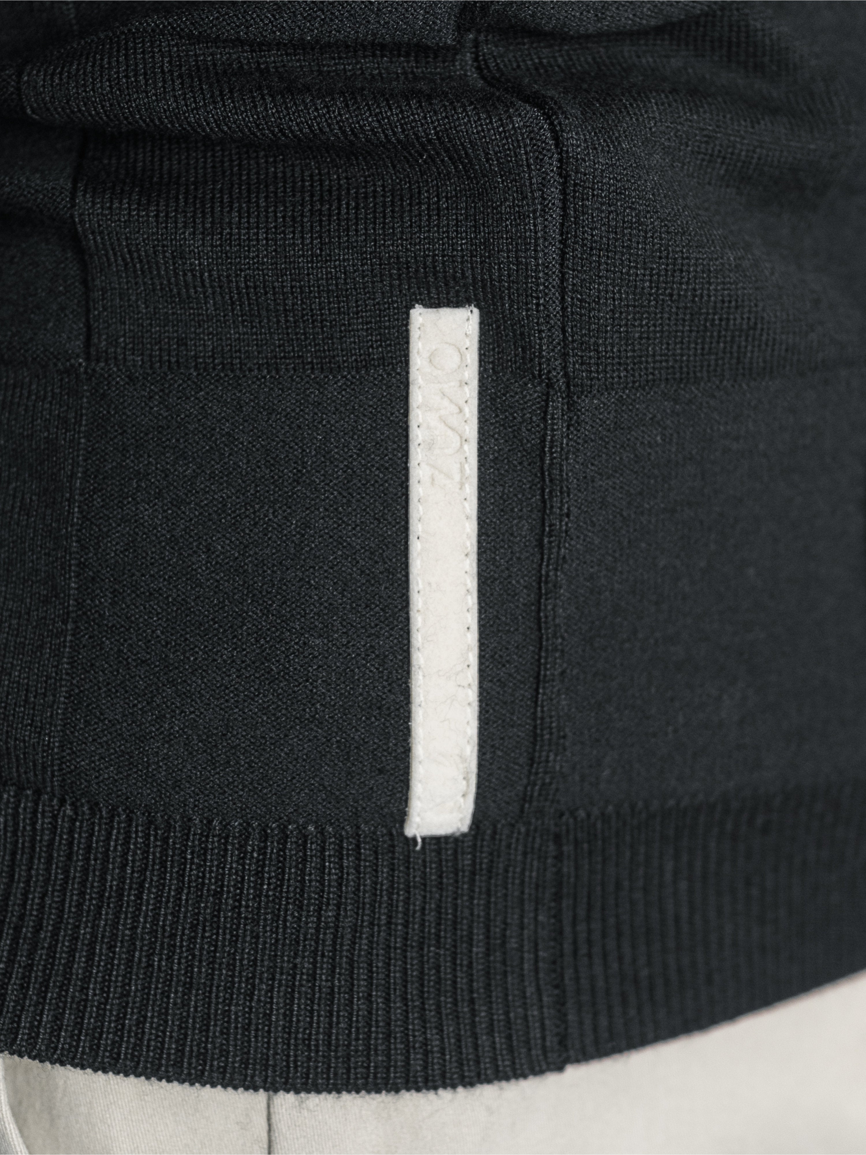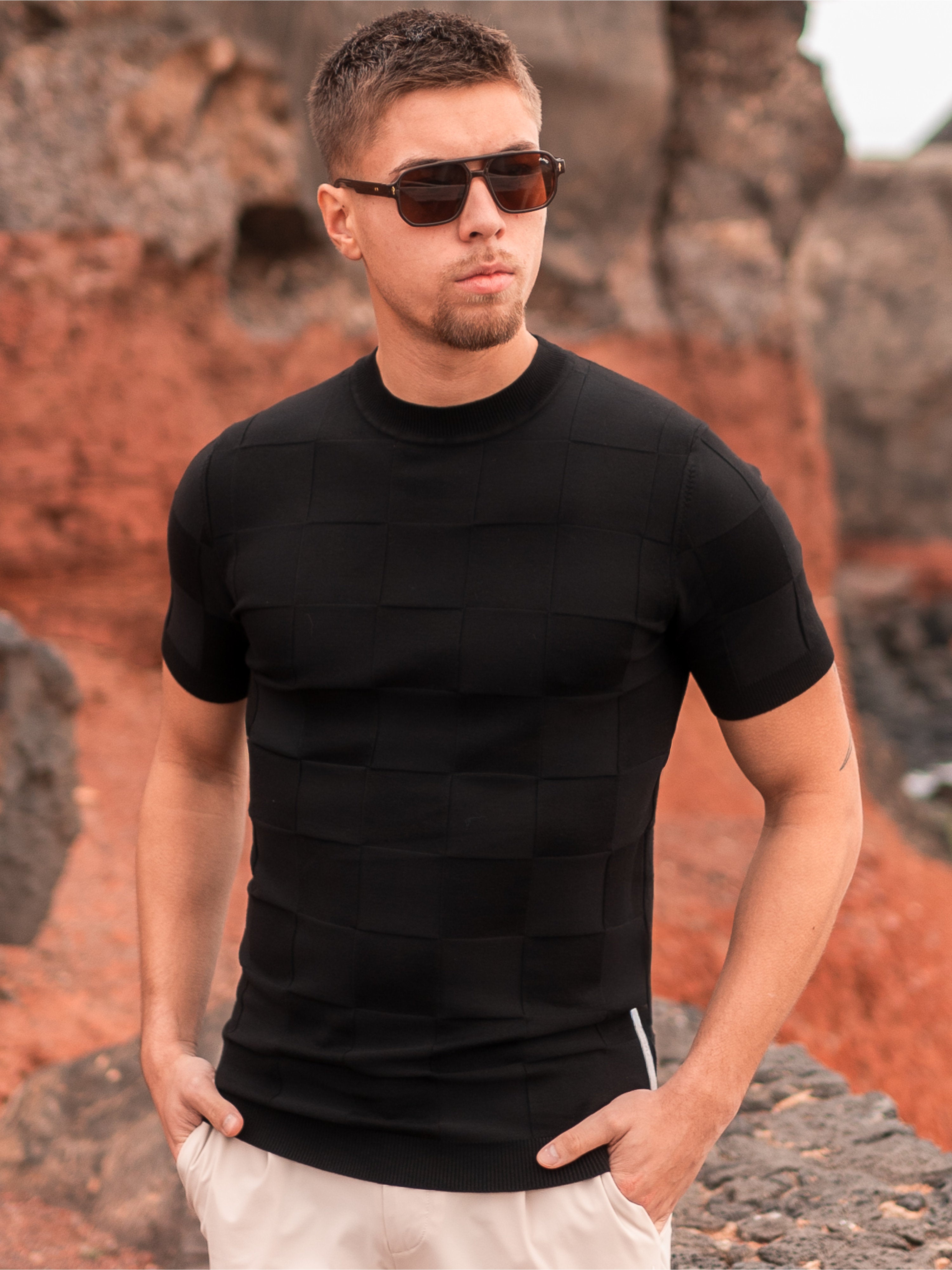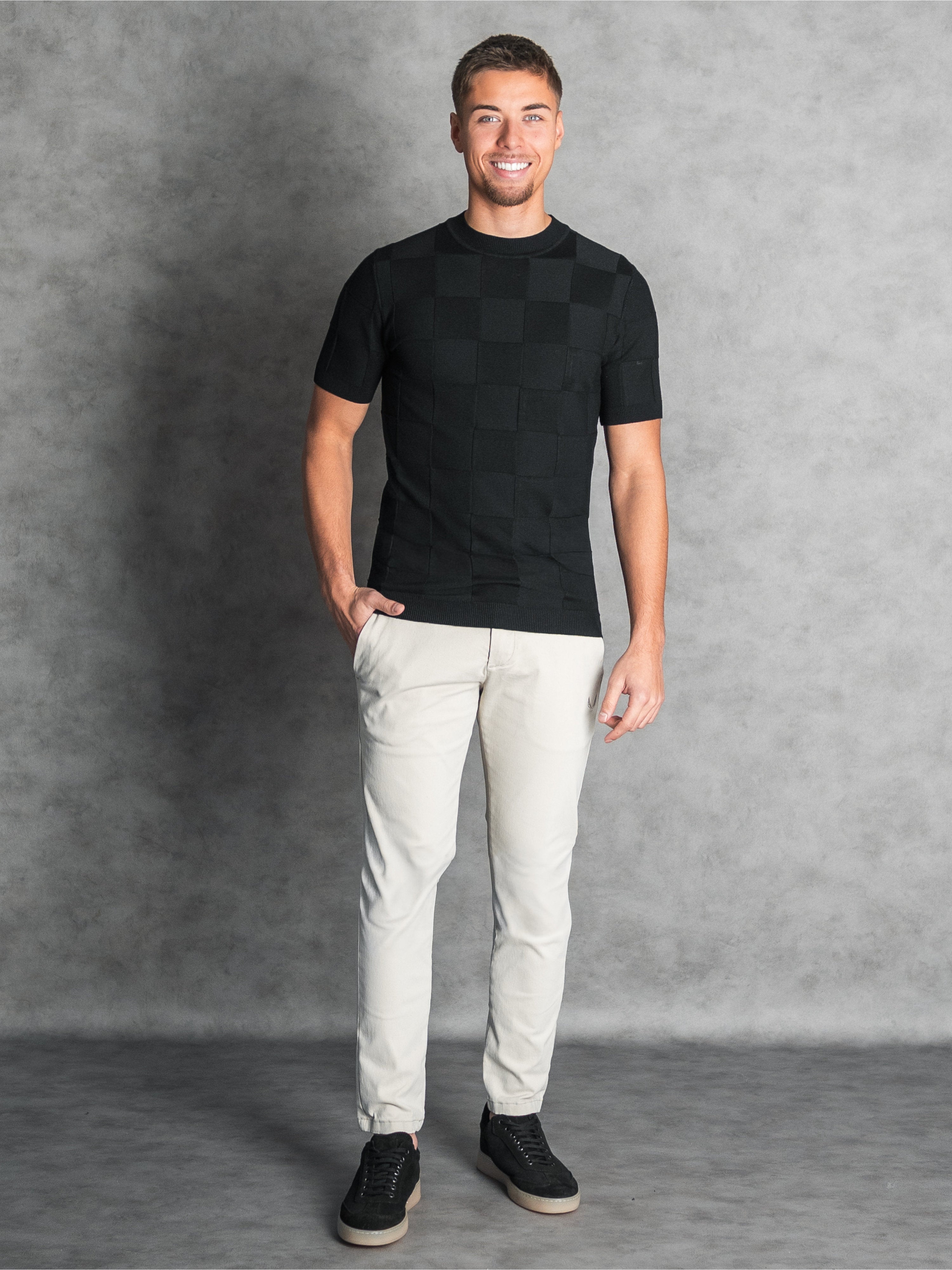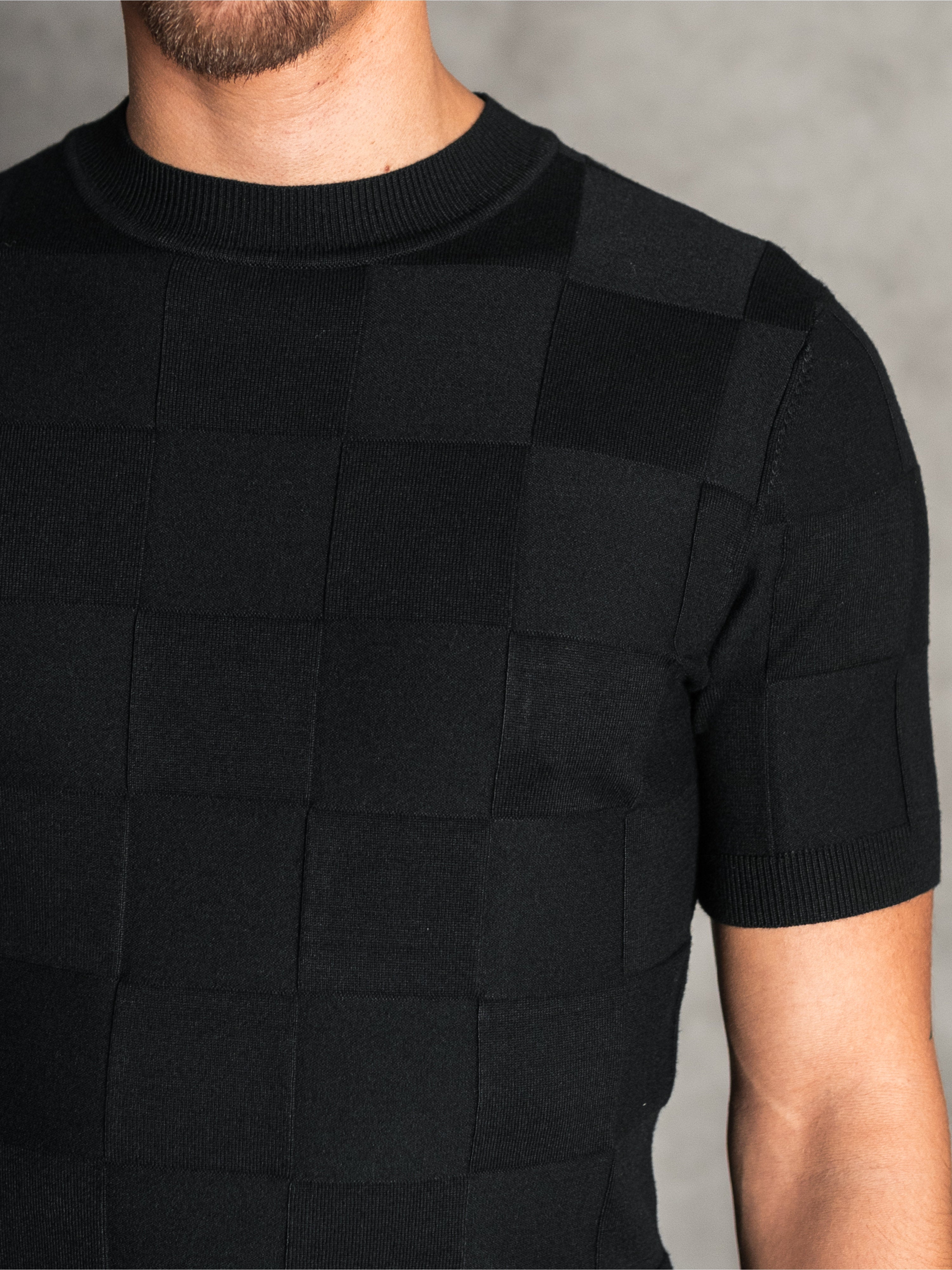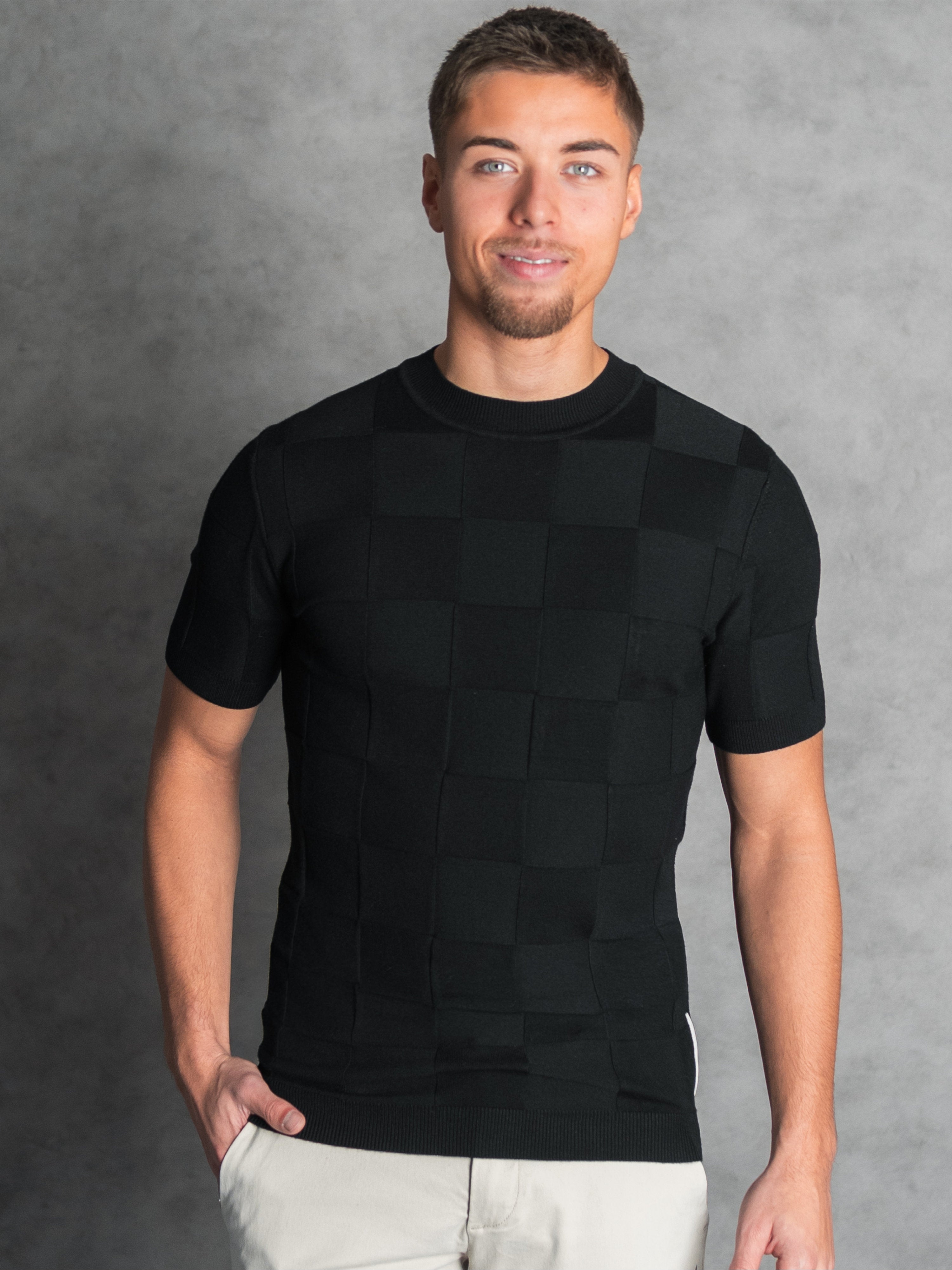 Make a subtle yet powerful statement with the Modena Crew Neck Knit in Black. At first glance, it’s a sleek black tee, but up close, the intricate checkerboard texture reveals a layer of depth and craftsmanship that sets it apart.