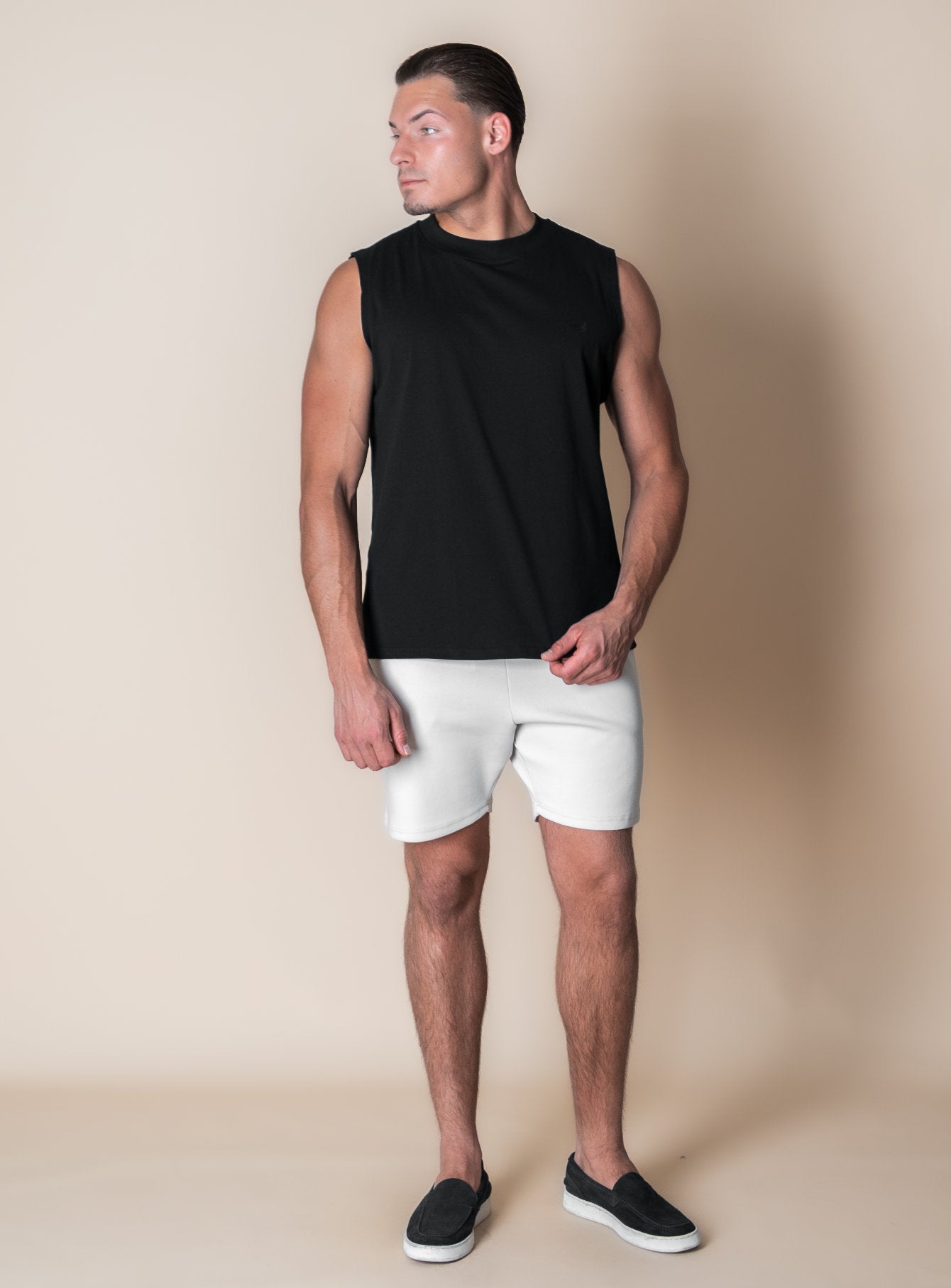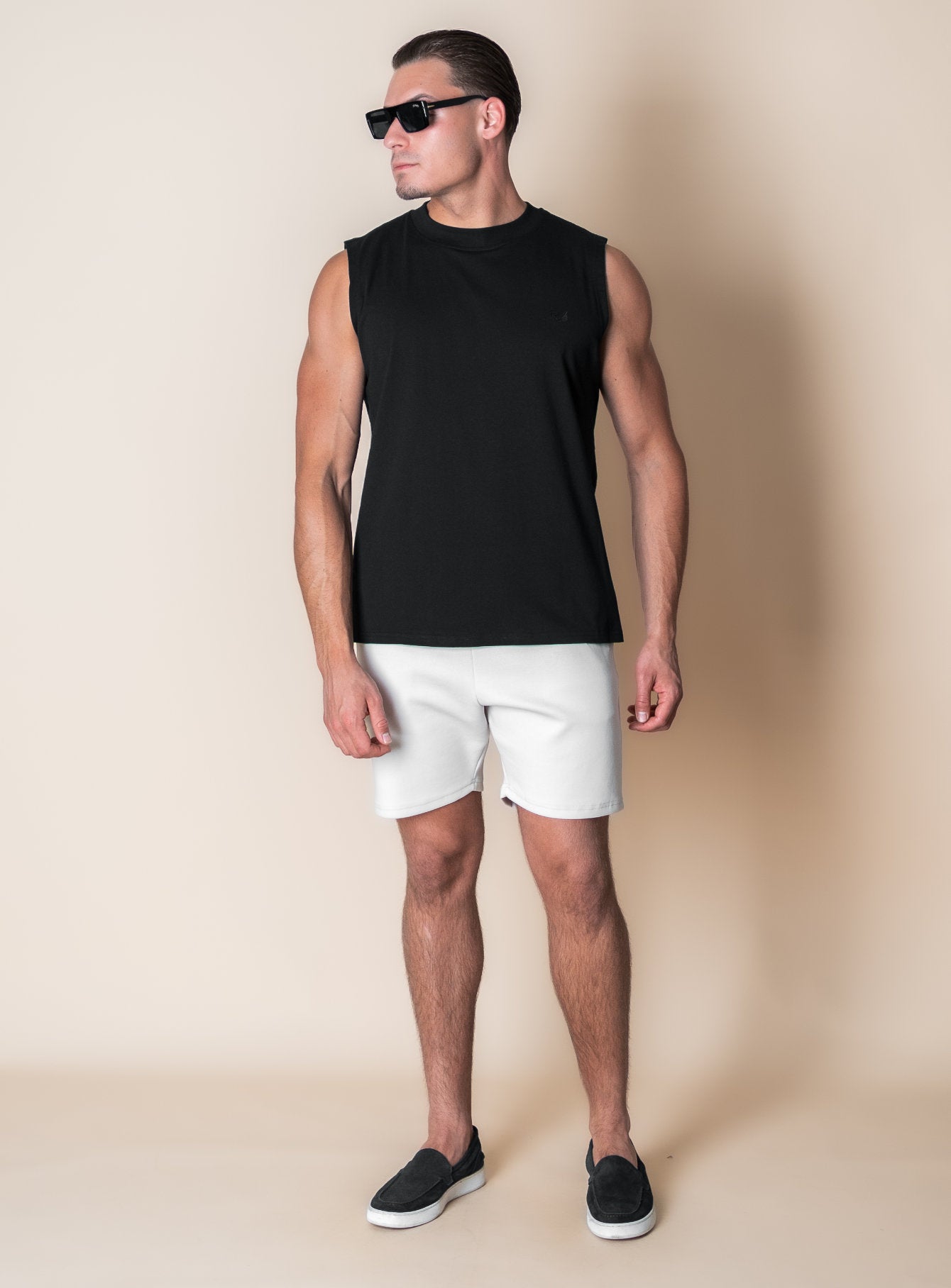 Pair the Sam sleeveless T-shirt with lightweight shorts or loose-fit trousers for a confident, no-fuss summer look.