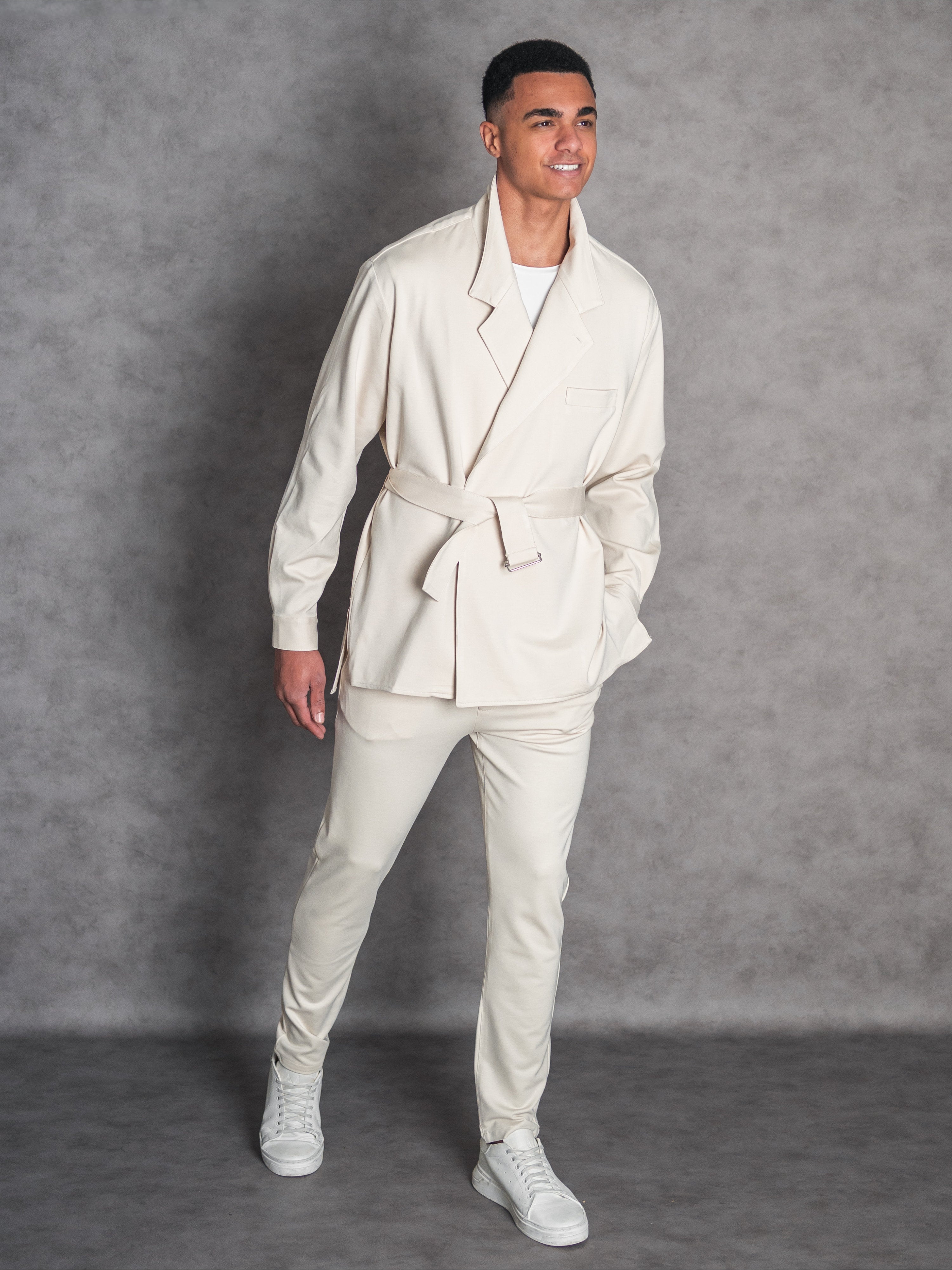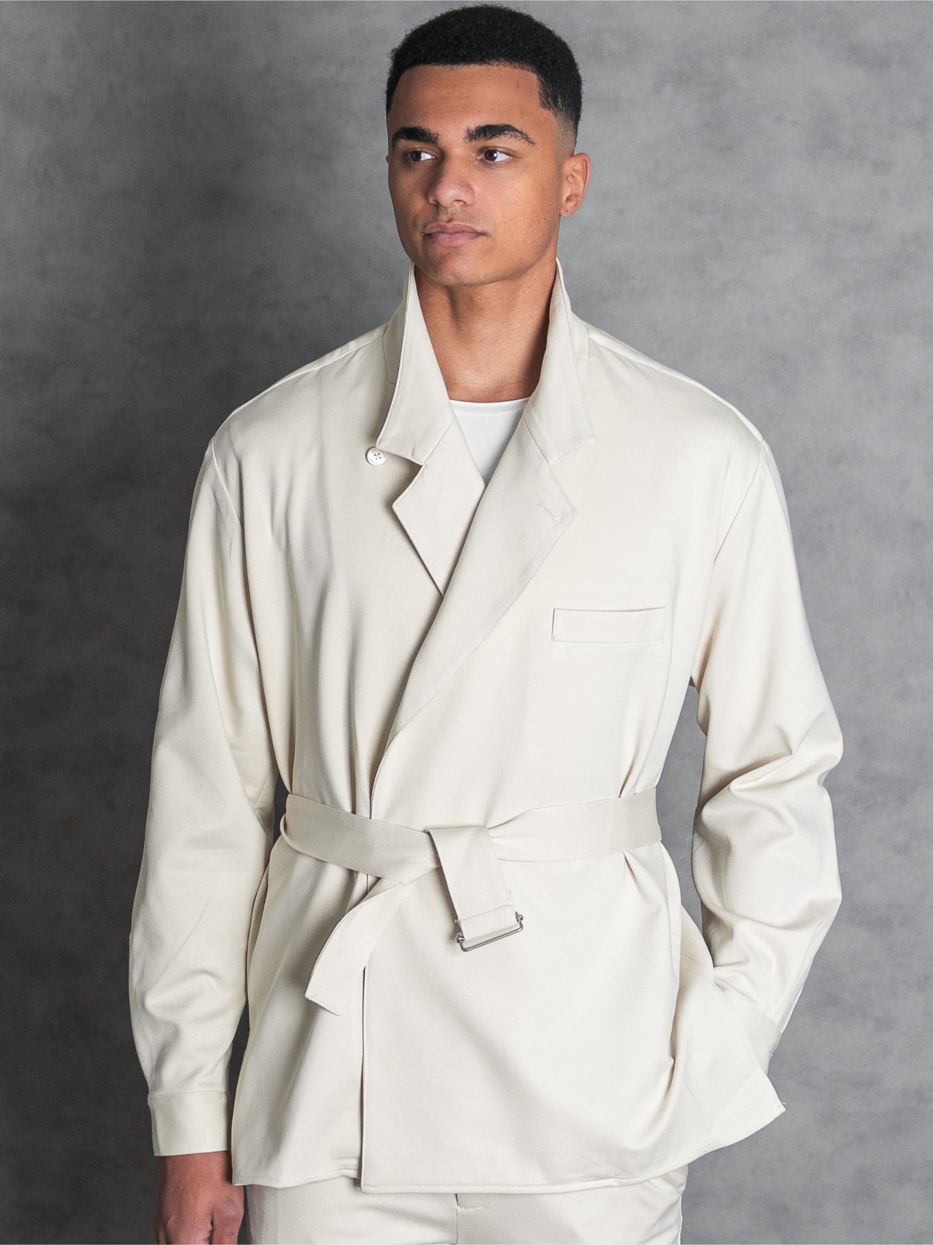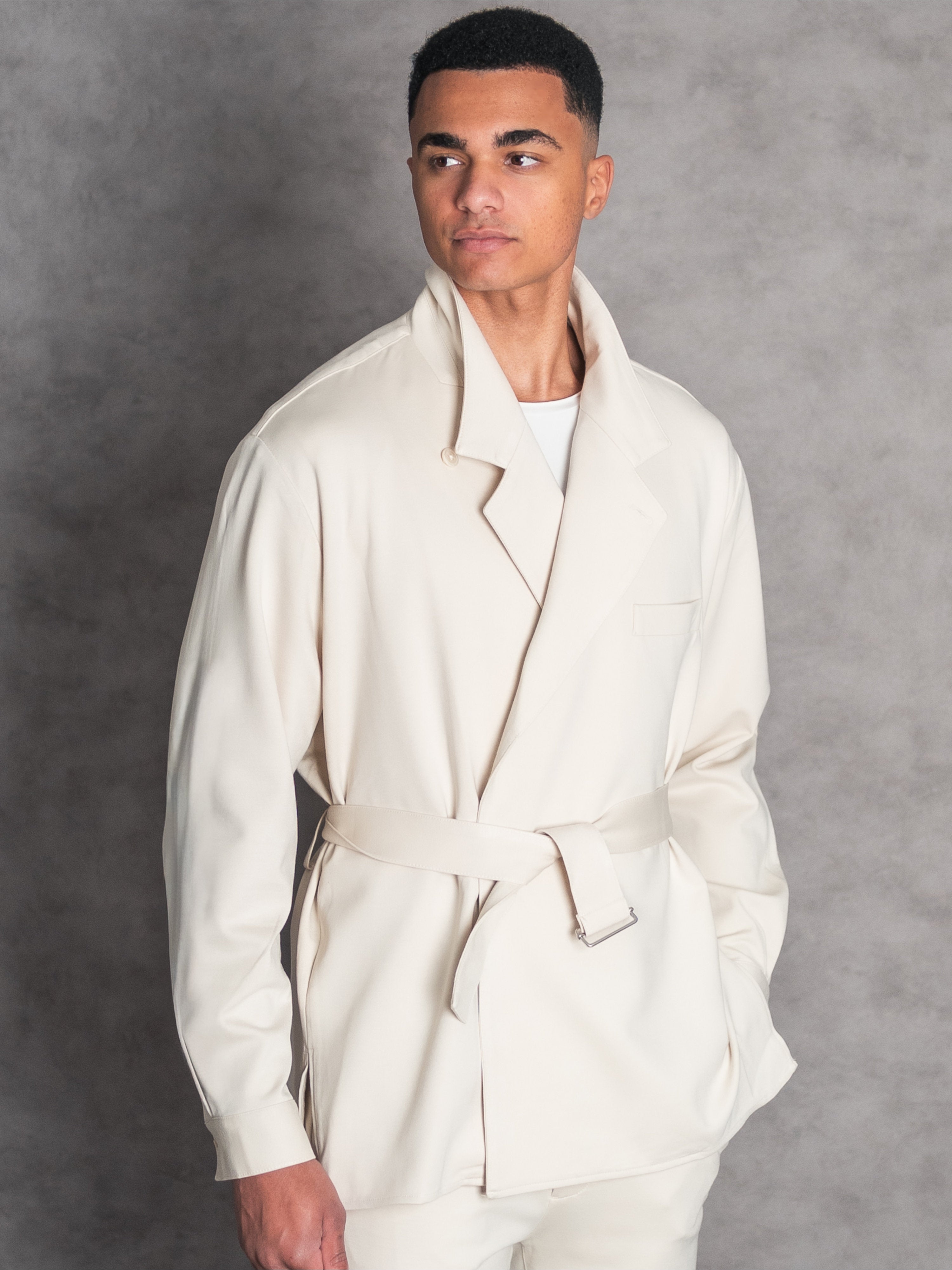 • Soft regular fit for a relaxed refined shape • Lightweight breathable fabric for all day comfort • Comfortable stretch that moves easily with you • Cross closure with a clean single button detail • Matching fabric belt for adjustable styling • Notch lapels for a modern tailored finish