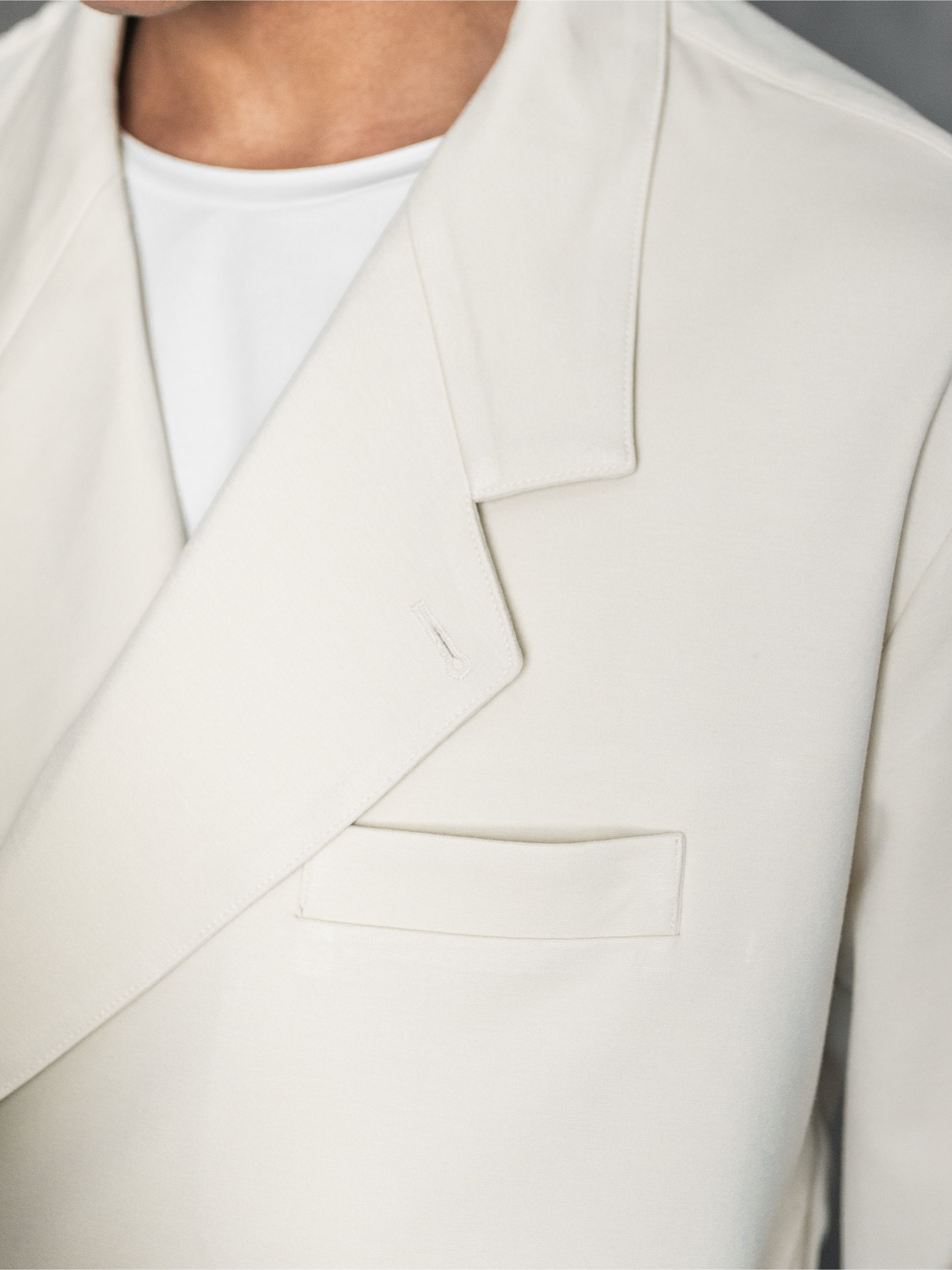 The Basil is a standout piece made for men who want something refined and different. Designed in a soft regular fit, it drapes clean over the body and moves easily thanks to its comfortable stretch. The lightweight breathable fabric makes it effortless to wear from day to night. The cross closure creates a modern wrapped look, finished with a single button and a matching fabric belt that lets you shape the fit your way. Notch lapels add a classic touch while the clean lines keep everything sharp and contemporary.