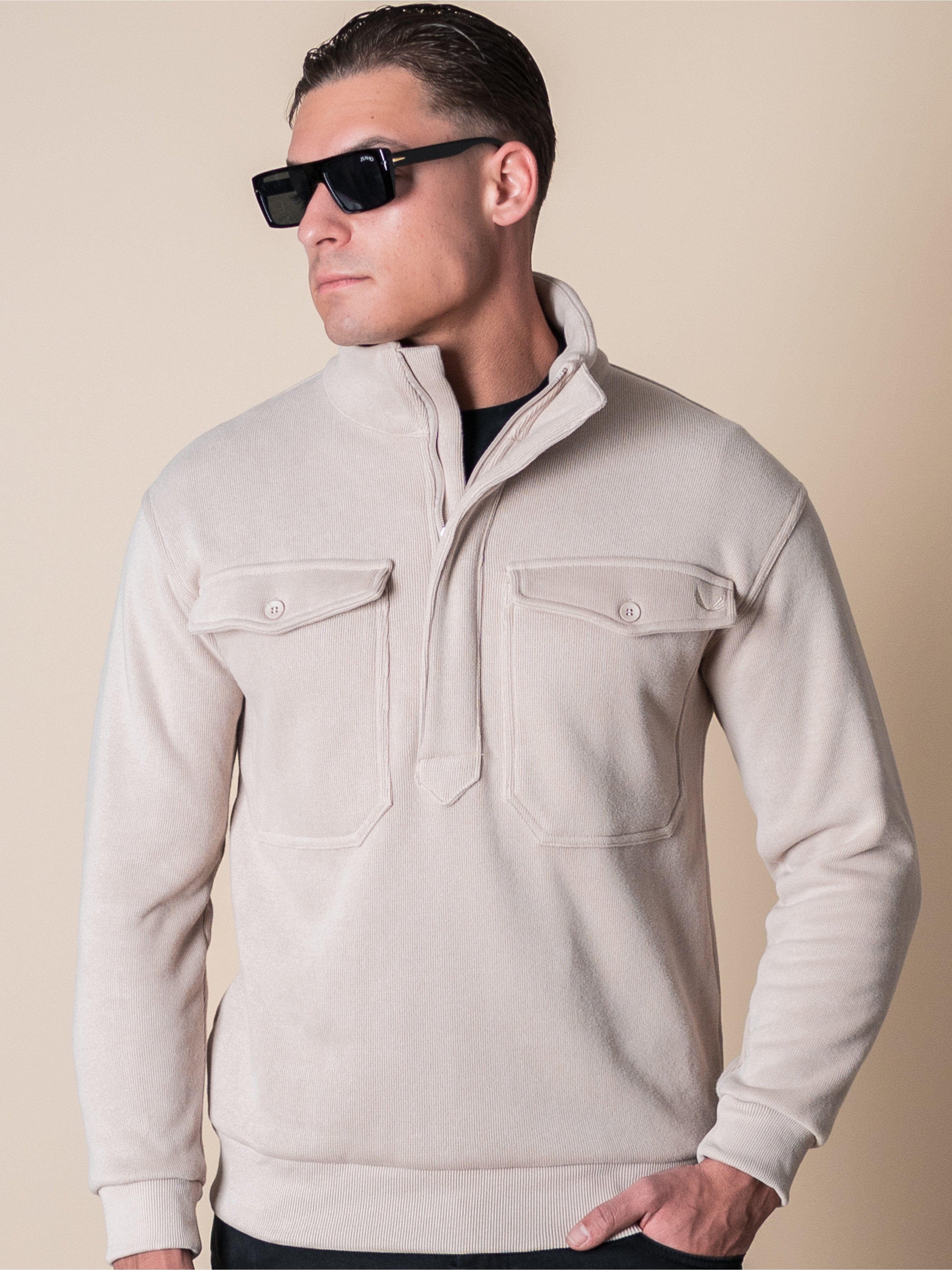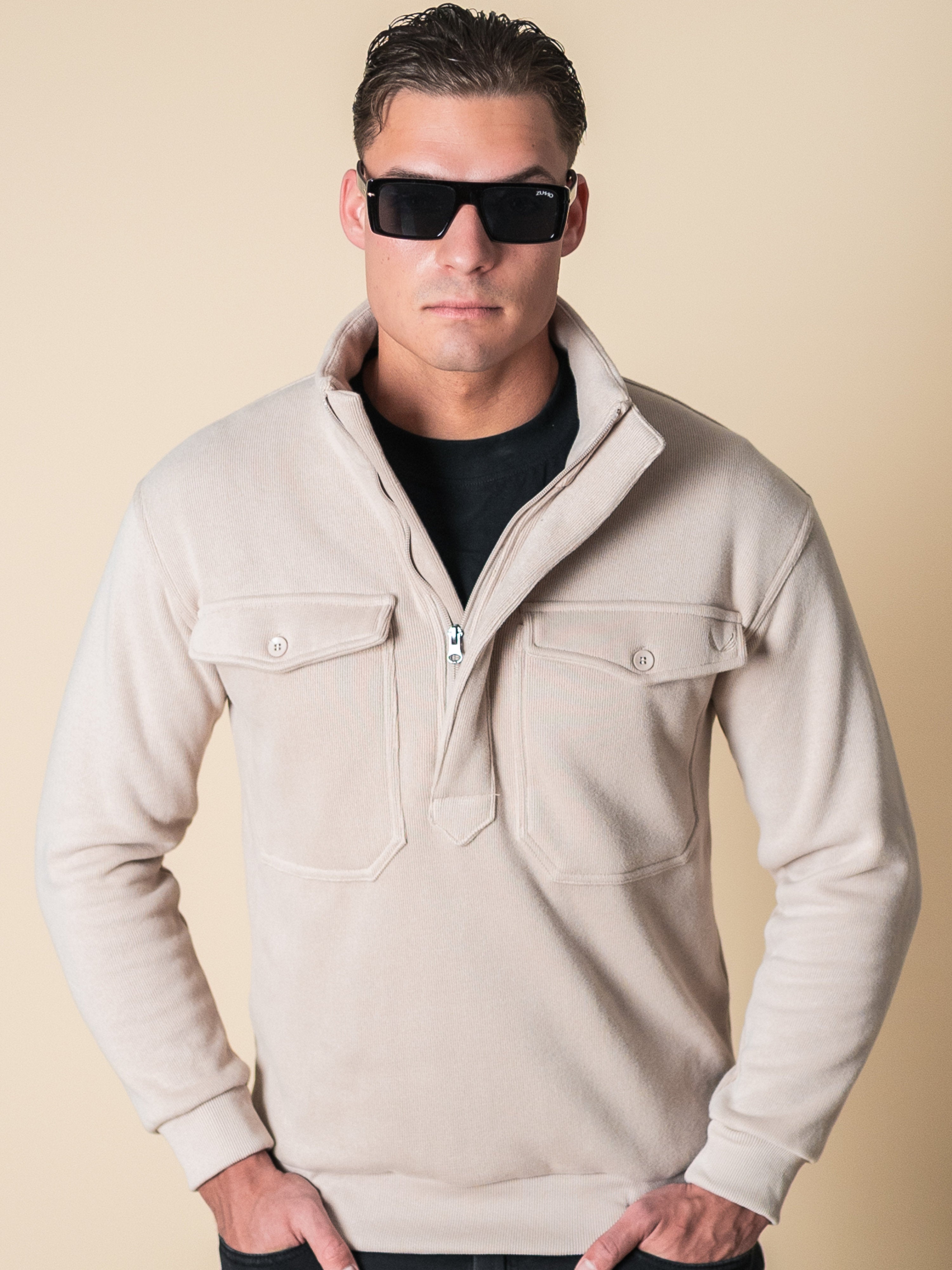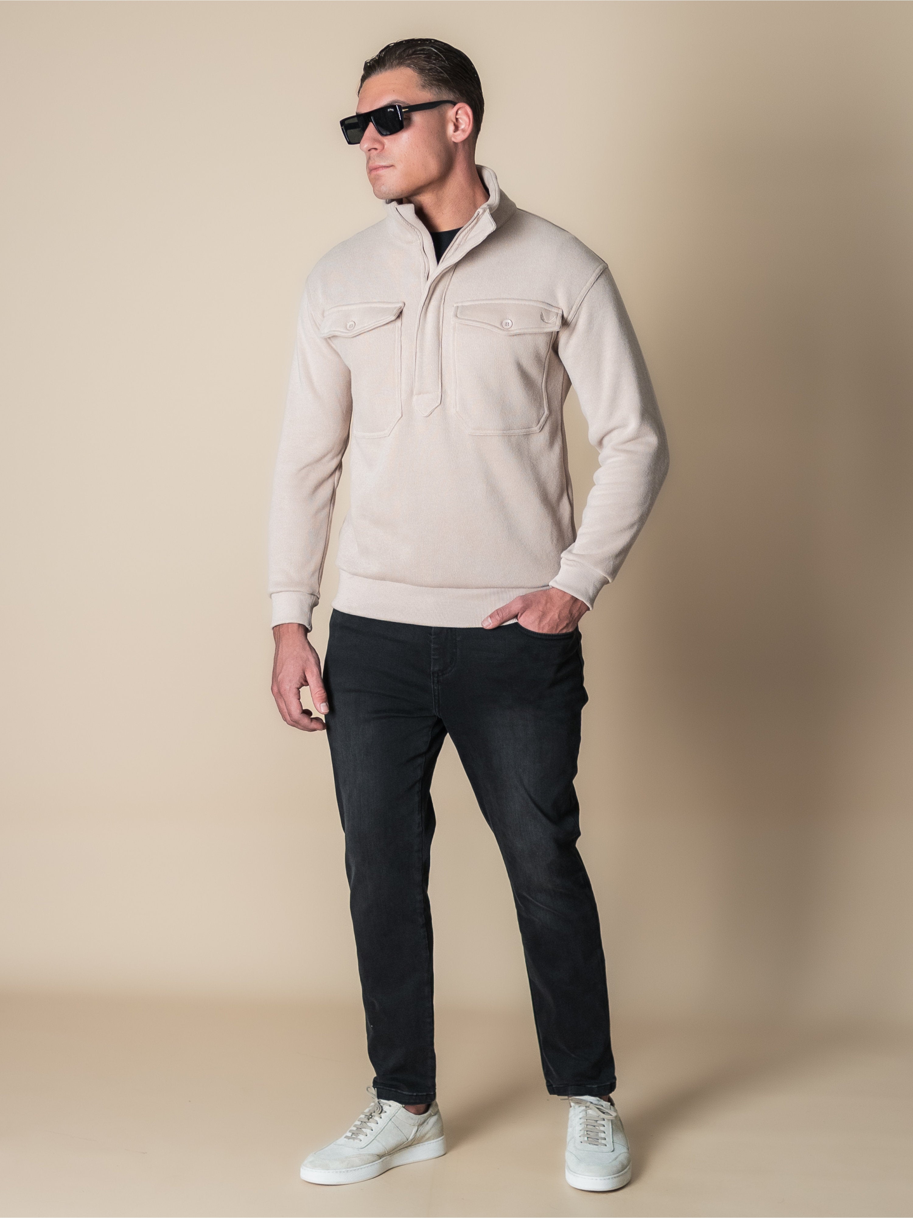 The Victor is built for warmth without losing edge. Cut in a regular fit, this pullover combines a structured outer look with a fleece-lined interior that keeps you comfortable when the temperature drops. The half-zip front and twin chest pockets add utility, while the clean silhouette makes it easy to style up or down. Strong in presence, effortless in wear.
