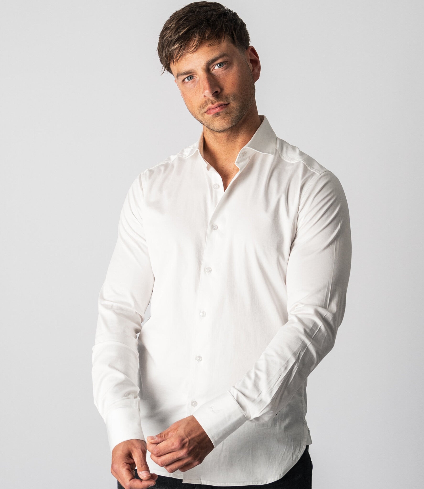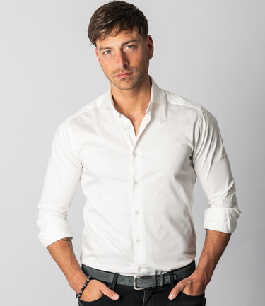 De Keith is een regular fit overhemd met een cutaway kraag. De cutaway kraag verscheen in de jaren 30 als alternatief voor de klassieke, smallere kragen. Omdat een cutaway kraag breder is, werd hij vaak gedragen in combinatie met een stropdas en een (brede) Windsor-knoop. Tegenwoordig wordt een cutaway kraag gezien als een elegant alternatief dat meer indruk maakt dan een standaard kraag. Het overhemd ziet er ook prachtig uit zonder stropdas. De Keith heeft een satijnen geweven stof, wat het overhemd een subtiele glans geeft. Dit geeft het tijdloze ontwerp van de Keith een moderne, chique uitstraling. Draag het overhemd met de bovenste twee knoopjes open voor een verfijnde look. De Keith maakt onze lijn met essentiële overhemden compleet. De Keith overhemden zijn verkrijgbaar in meerdere kleuren