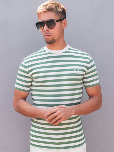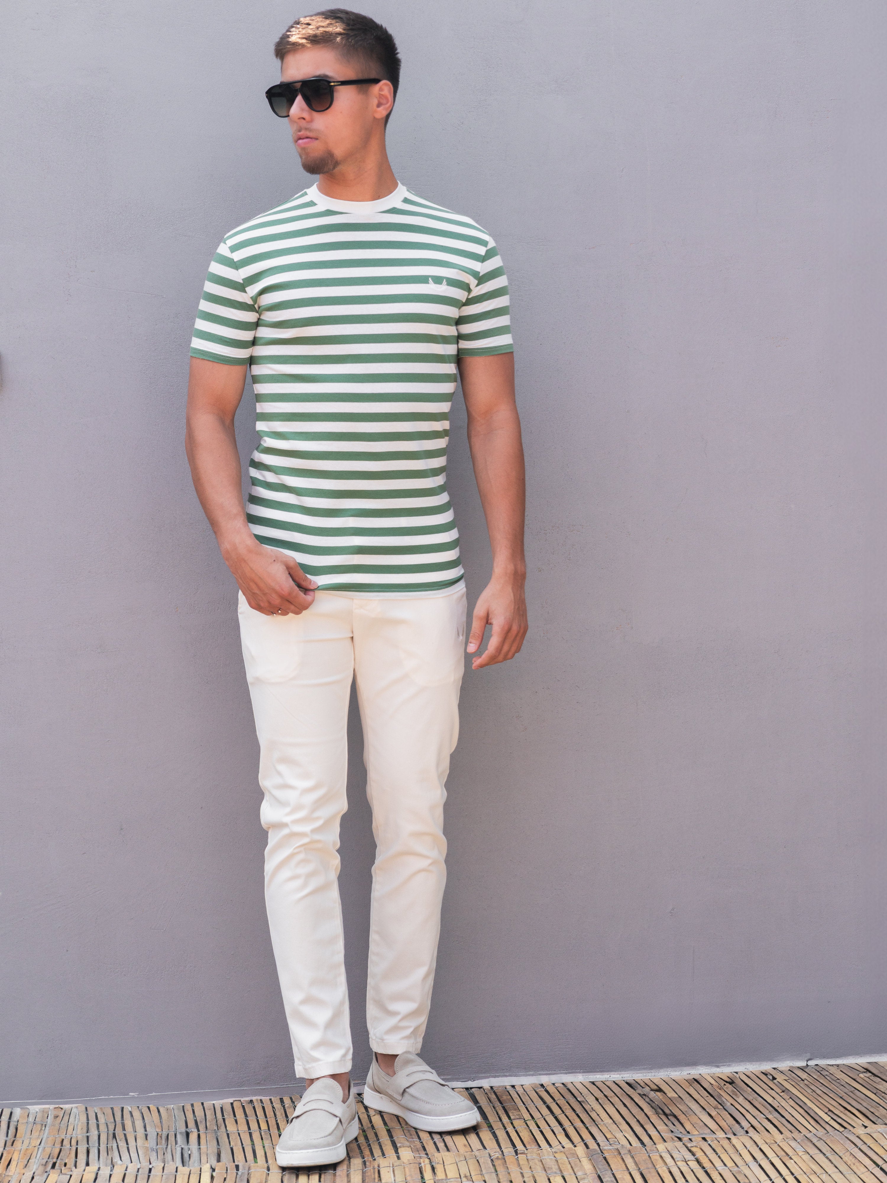 The Stone Striped tee keeps it fitted, clean and sharp with a classic twist. Designed in a slim fit that highlights the upper body, it brings a bold stripe pattern without going over the top. The soft knit feels smooth on the skin and moves with you throughout the day. Contrast trim at the collar and sleeves adds a subtle retro touch that pulls the whole look together.