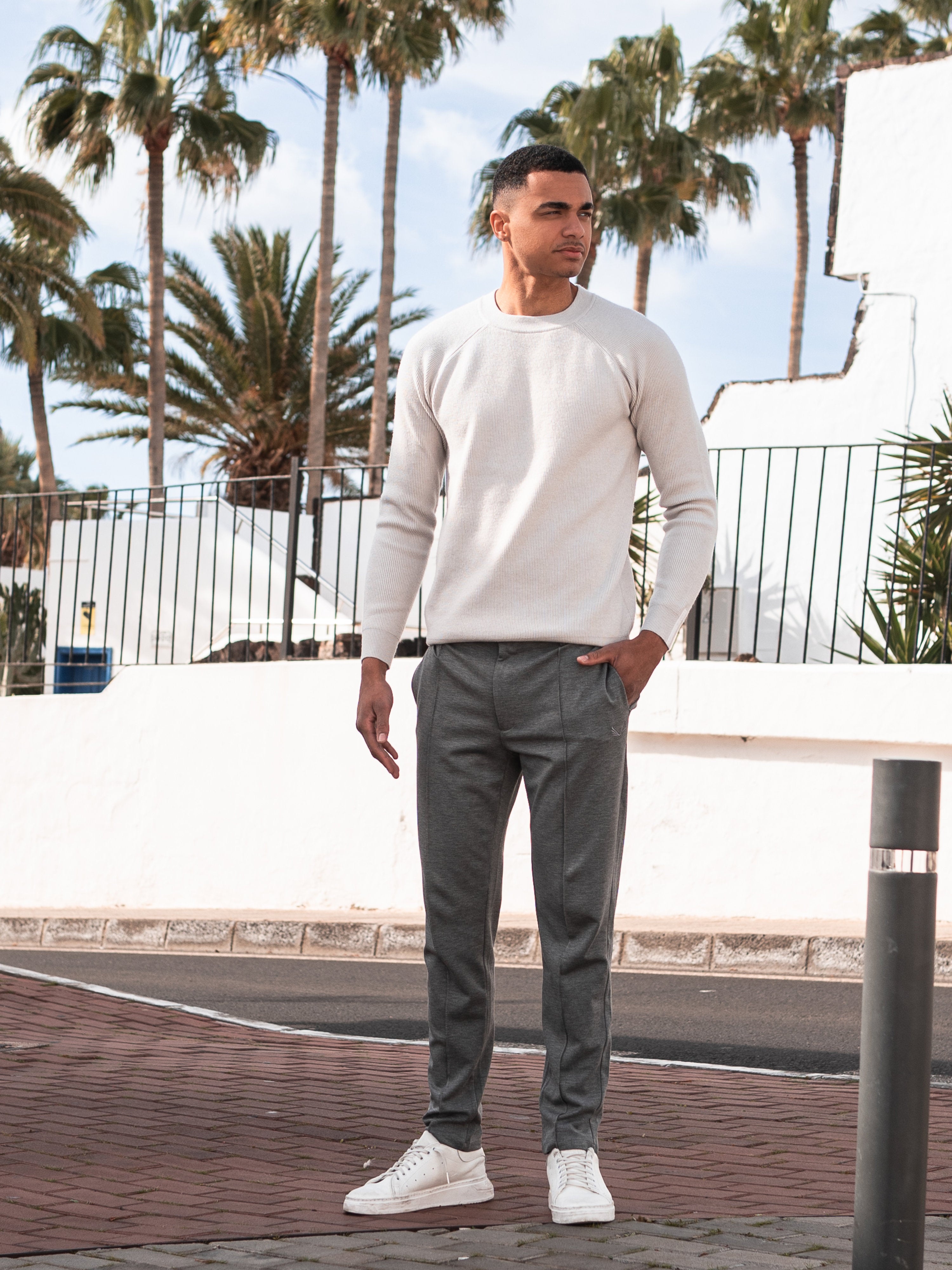 Style Tip: Sindal IceGrey został stworzony z myślą o wszechstronnych, nowoczesnych stylizacjach. Aby uzyskać czysty, monochromatyczny look, zestaw go z szarymi spodniami i białymi loafersami, zgodnie z naszą stylizacją. Idealnie kontrastuje również z ciemnogranatowymi chinosami lub czarnymi jeansami. Niezależnie od tego, czy nosisz go solo, czy pod dopasowaną marynarką, jego tekstura i chłodny odcień czynią go niezbędnym elementem kolekcji.