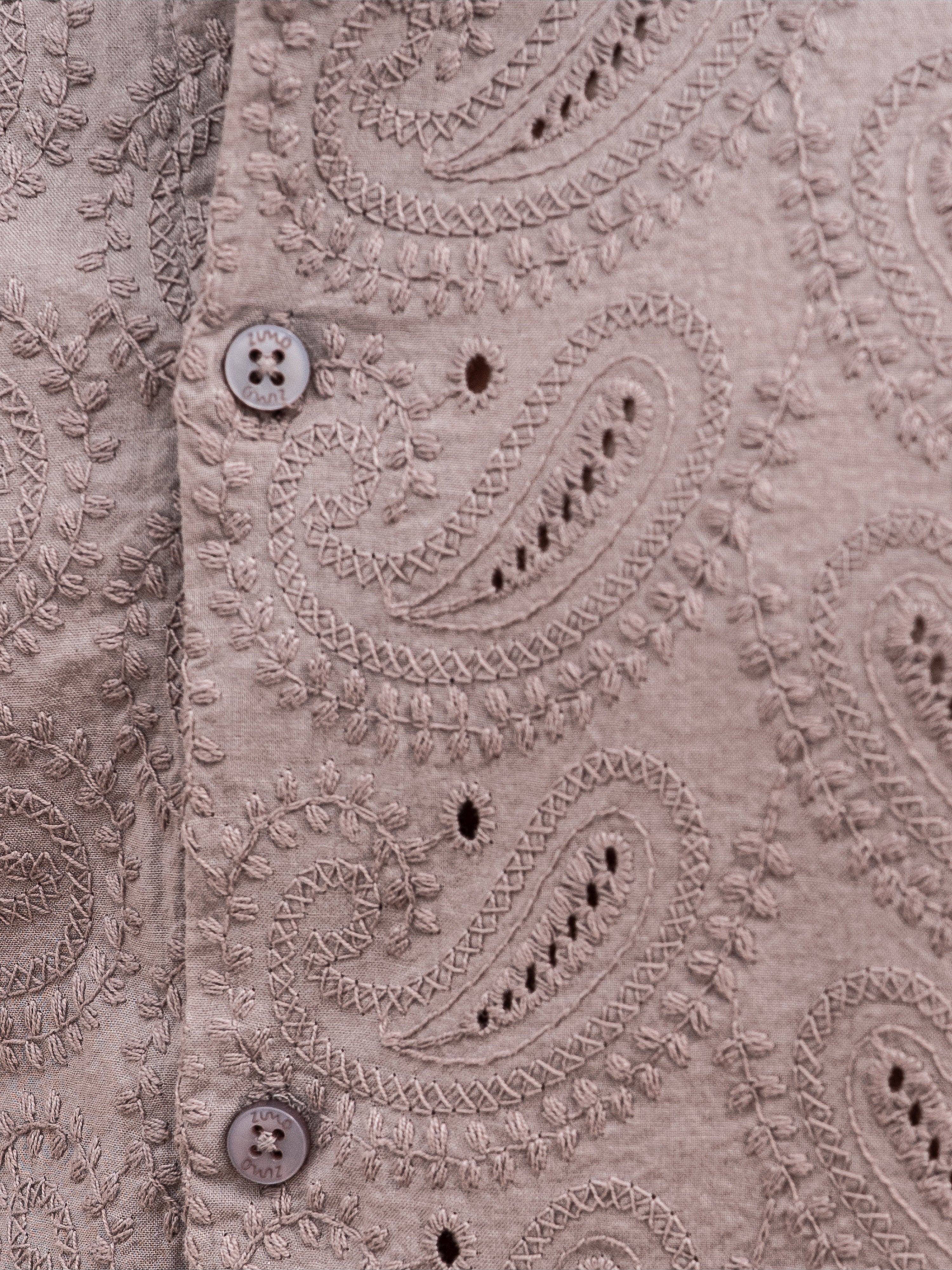 Upgrade your wardrobe with the understated luxury of the Keith-Paisley shirt in Truffle. The warm taupe shade provides the perfect canvas for the complex paisley motif, applied using the artisanal broderie anglaise technique.