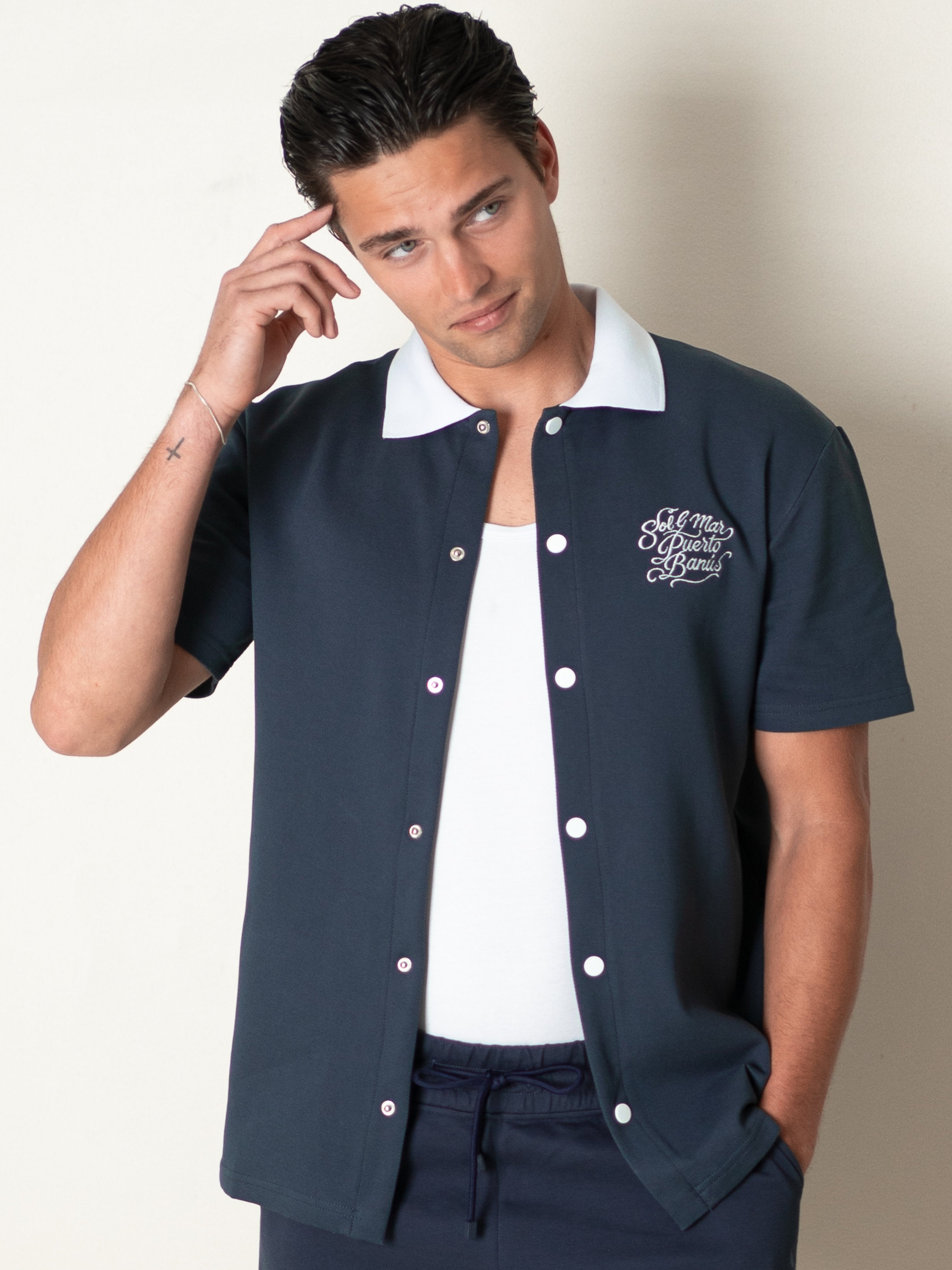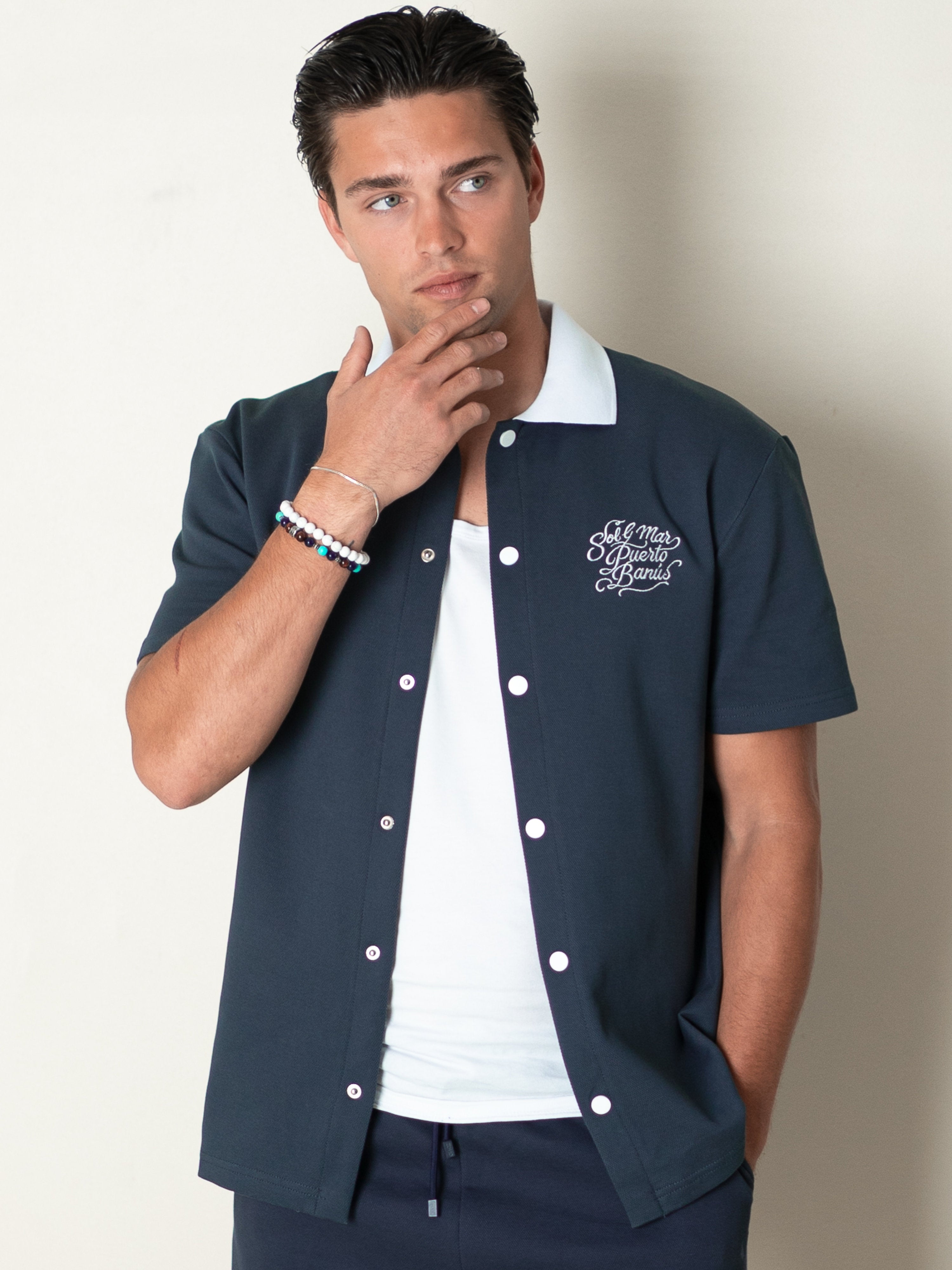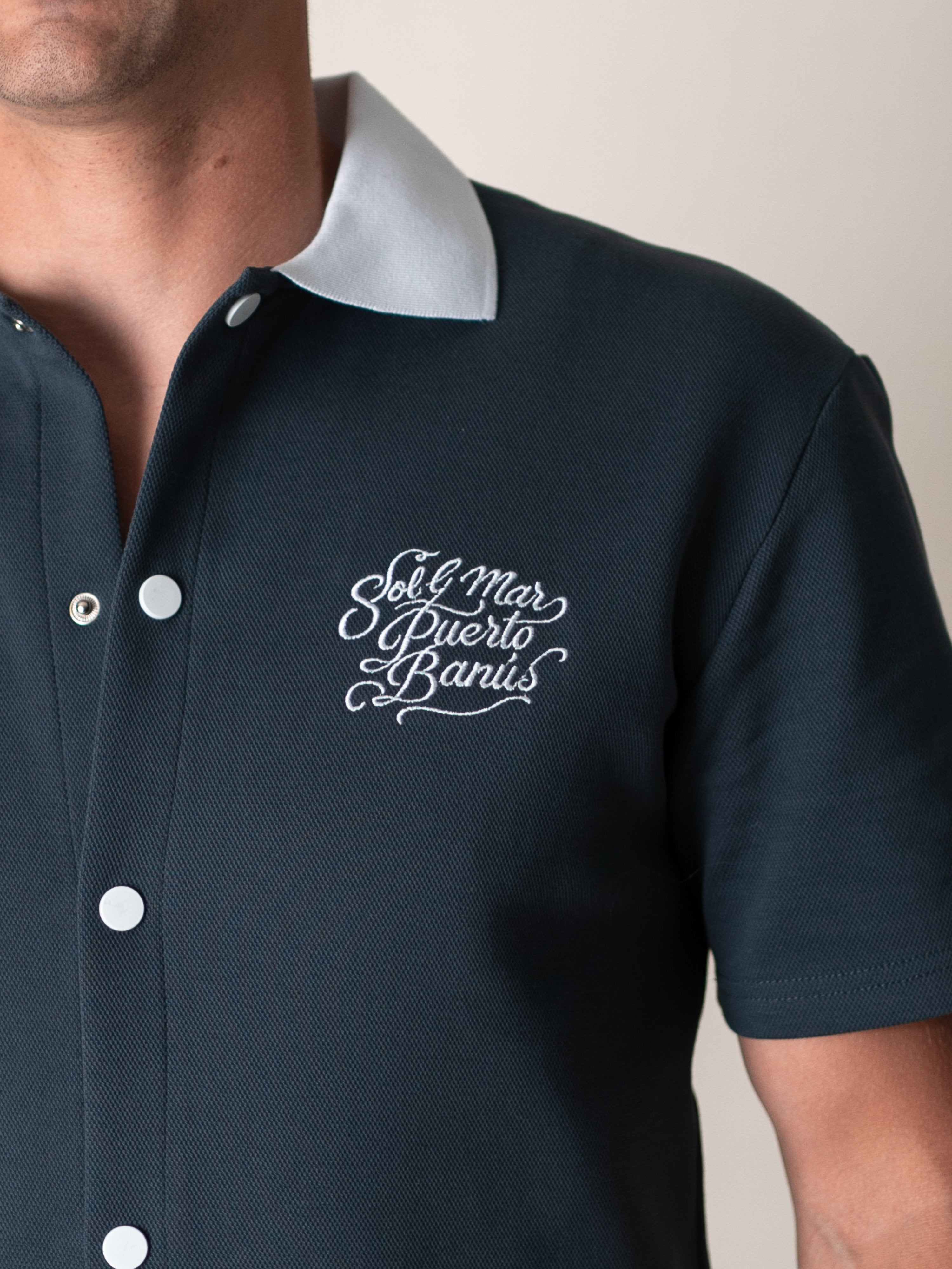 Elevate your summer wardrobe with the BRUMEL Ink Overshirt. This piece blends the structure of an overshirt with the breathable comfort of high-quality piqué fabric. Featuring a striking contrast collar and distinctive 'Sol & Mar Puerto Banús' embroidery, it captures the essence of Mediterranean luxury.