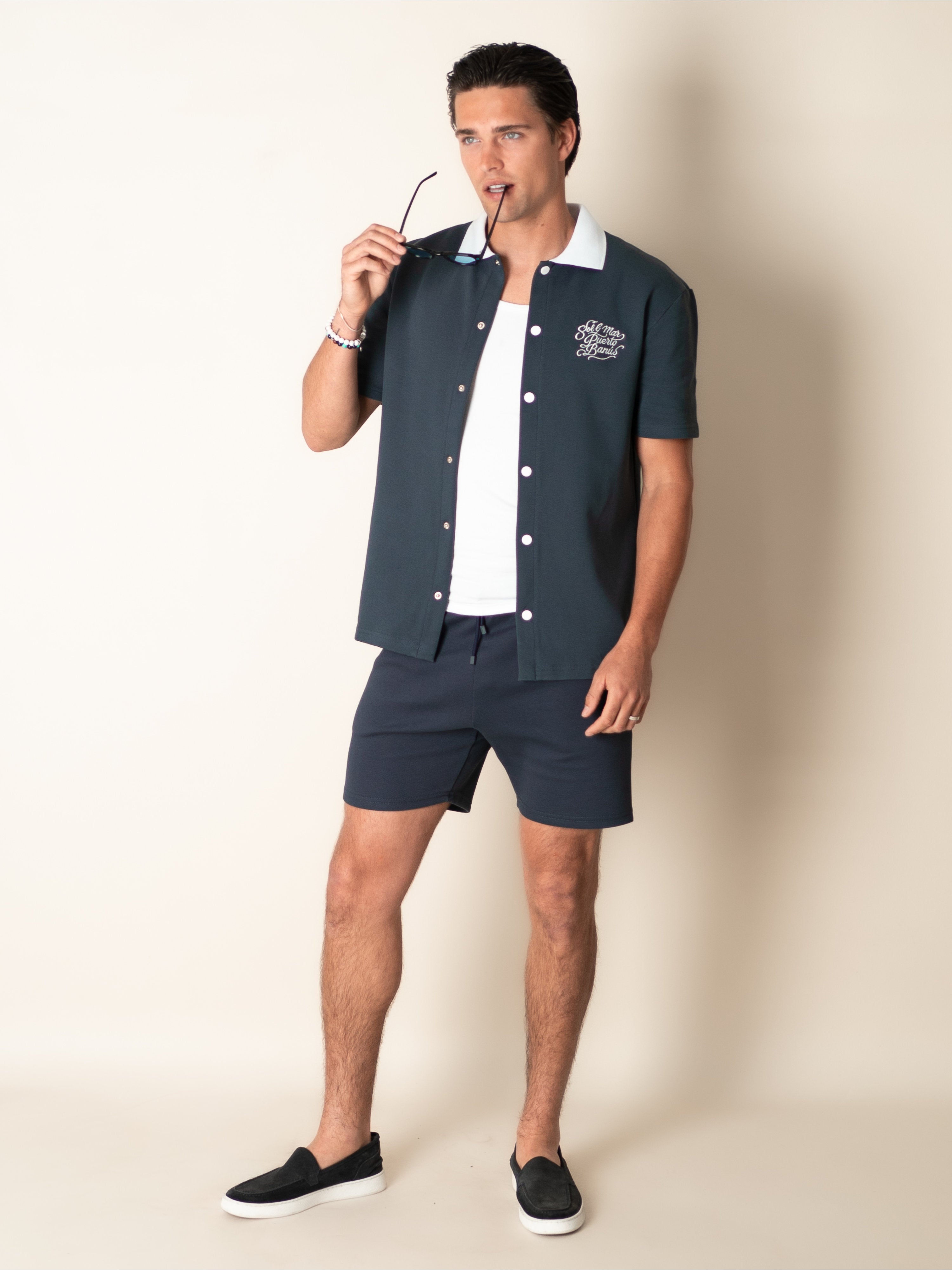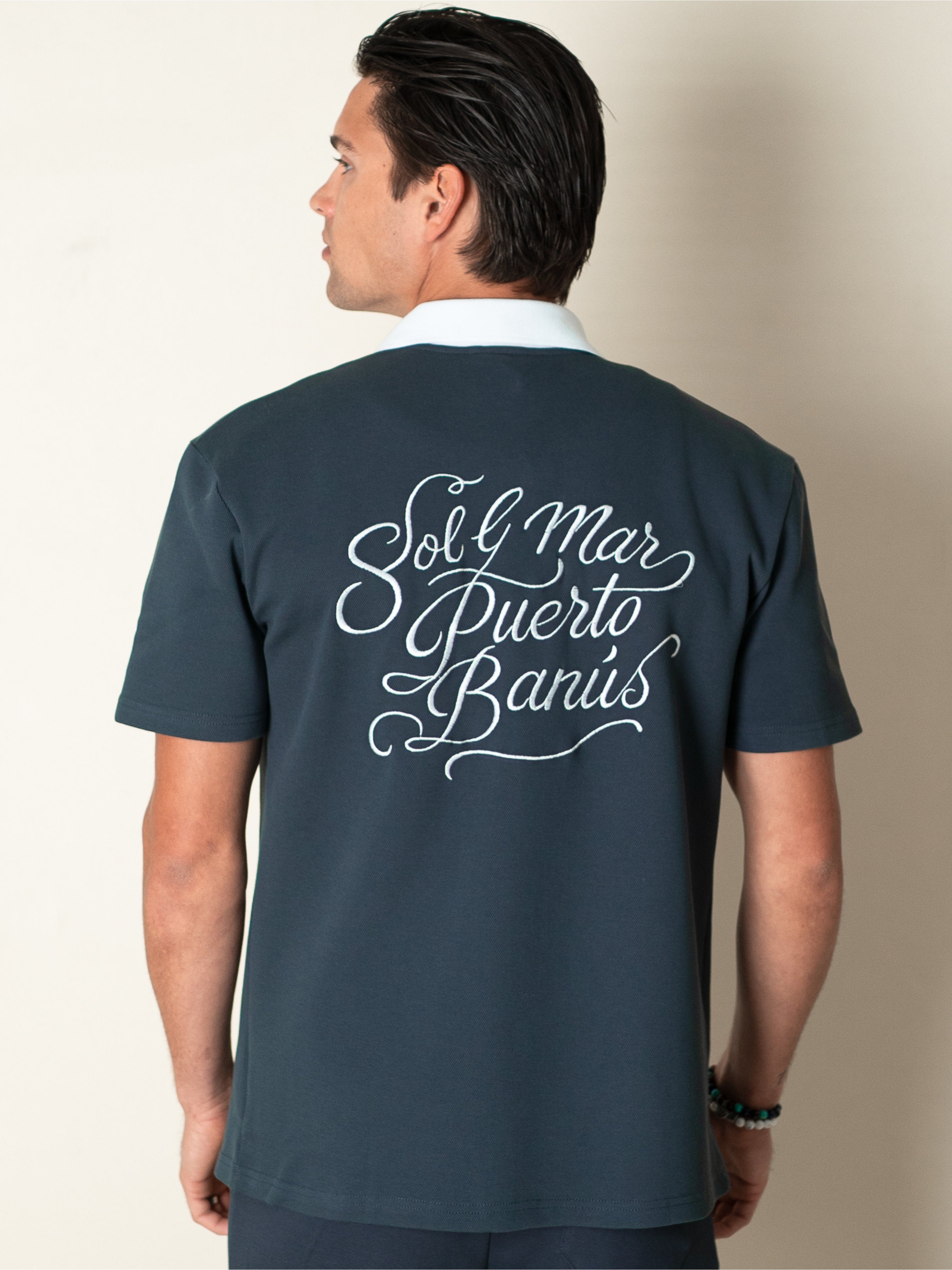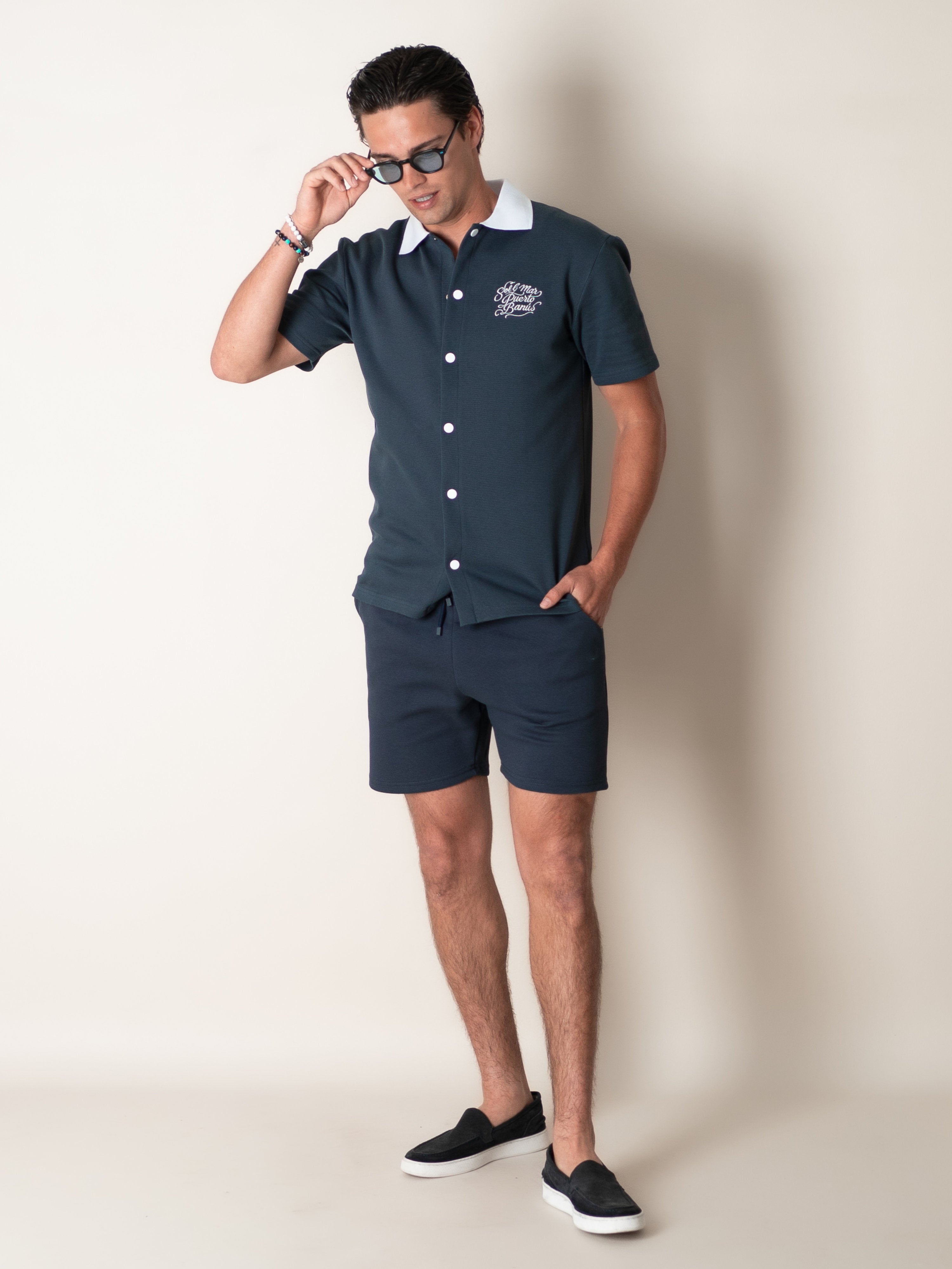 Elevate your summer wardrobe with the BRUMEL Ink Overshirt. This piece blends the structure of an overshirt with the breathable comfort of high-quality piqué fabric. Featuring a striking contrast collar and distinctive 'Sol & Mar Puerto Banús' embroidery, it captures the essence of Mediterranean luxury.