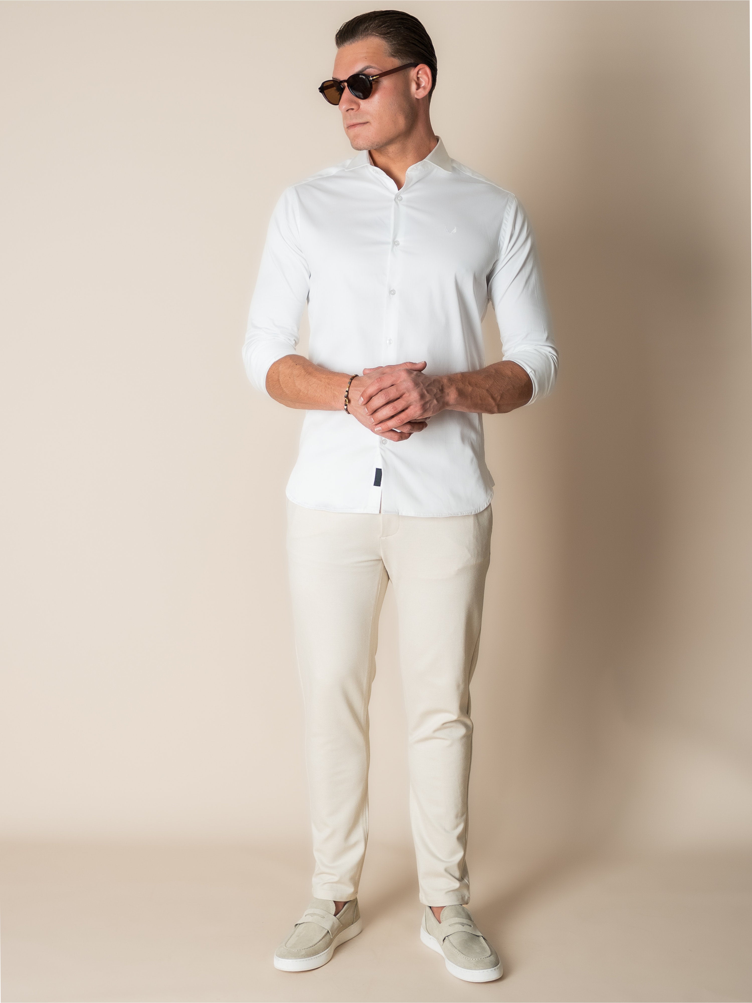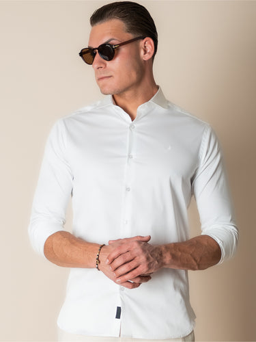 The Keith is a regular fit shirt with a cutaway collar. The cutaway collar appeared in the 1930s as an alternative to the classic, narrower collars. Because a cutaway collar has a wider spread, it was often worn in combination with a tie and a (wide) Windsor knot. Today, a cutaway collar is considerd an elegant alternative that makes a bigger statement than a standard collar. The shirt also looks great without a tie. The Keith has a satin woven fabric, which gives the shirt a subtle shine. This gives the timeless design of the Keith a modern, chic look. Wear the shirt with the top two buttons open for a sophisticated look. The Keith completes our line of essential shirts. The Keith shirts are available in multiple colors
