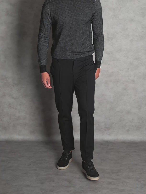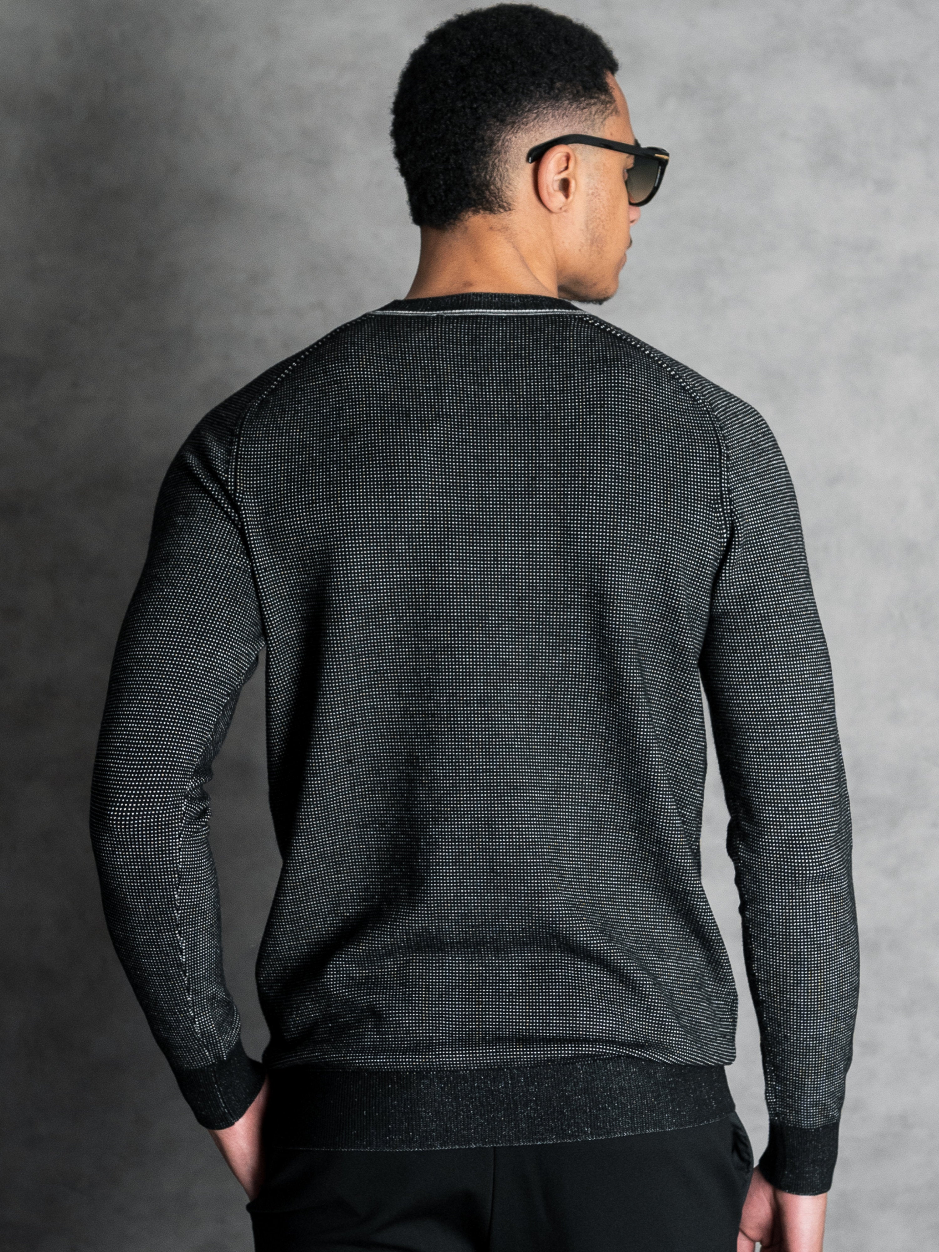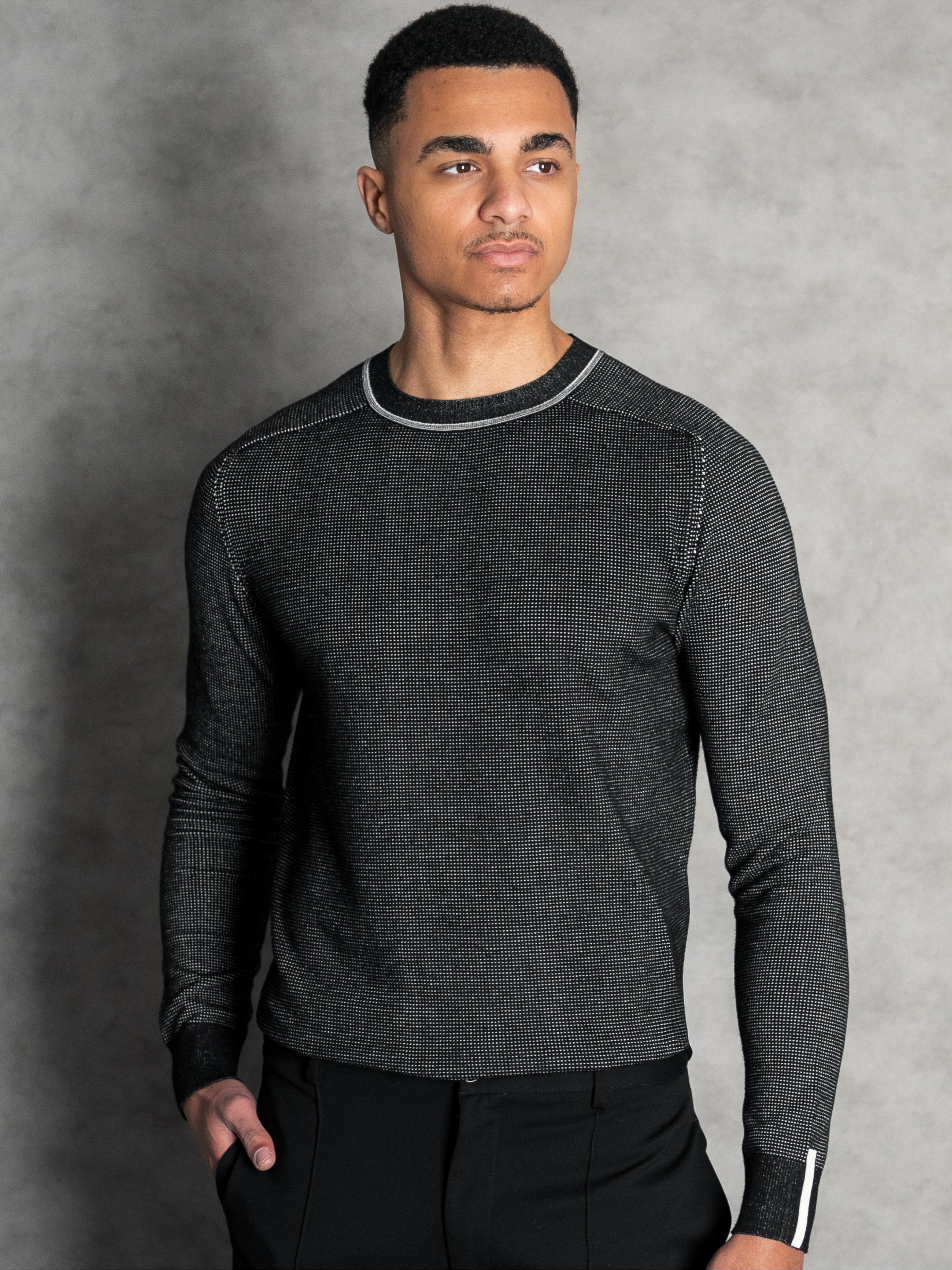 The Skipsby Black-Cream offers a powerful, industrial aesthetic. By using a reversed micro-weave, this pullover achieves a deep charcoal effect with subtle light highlights. It is a technical essential for the man who prefers a "Clean Dark" look with visual depth and character.