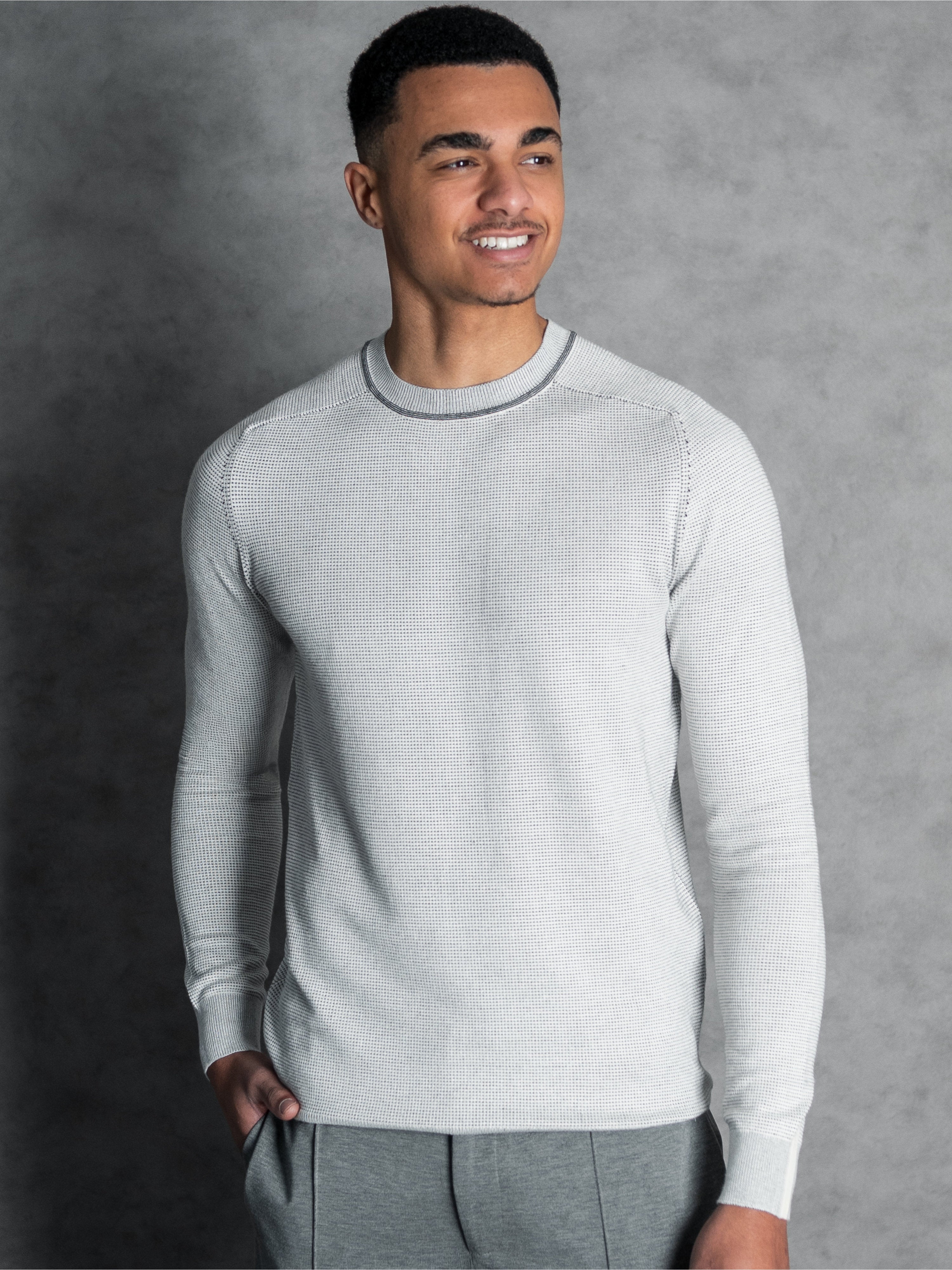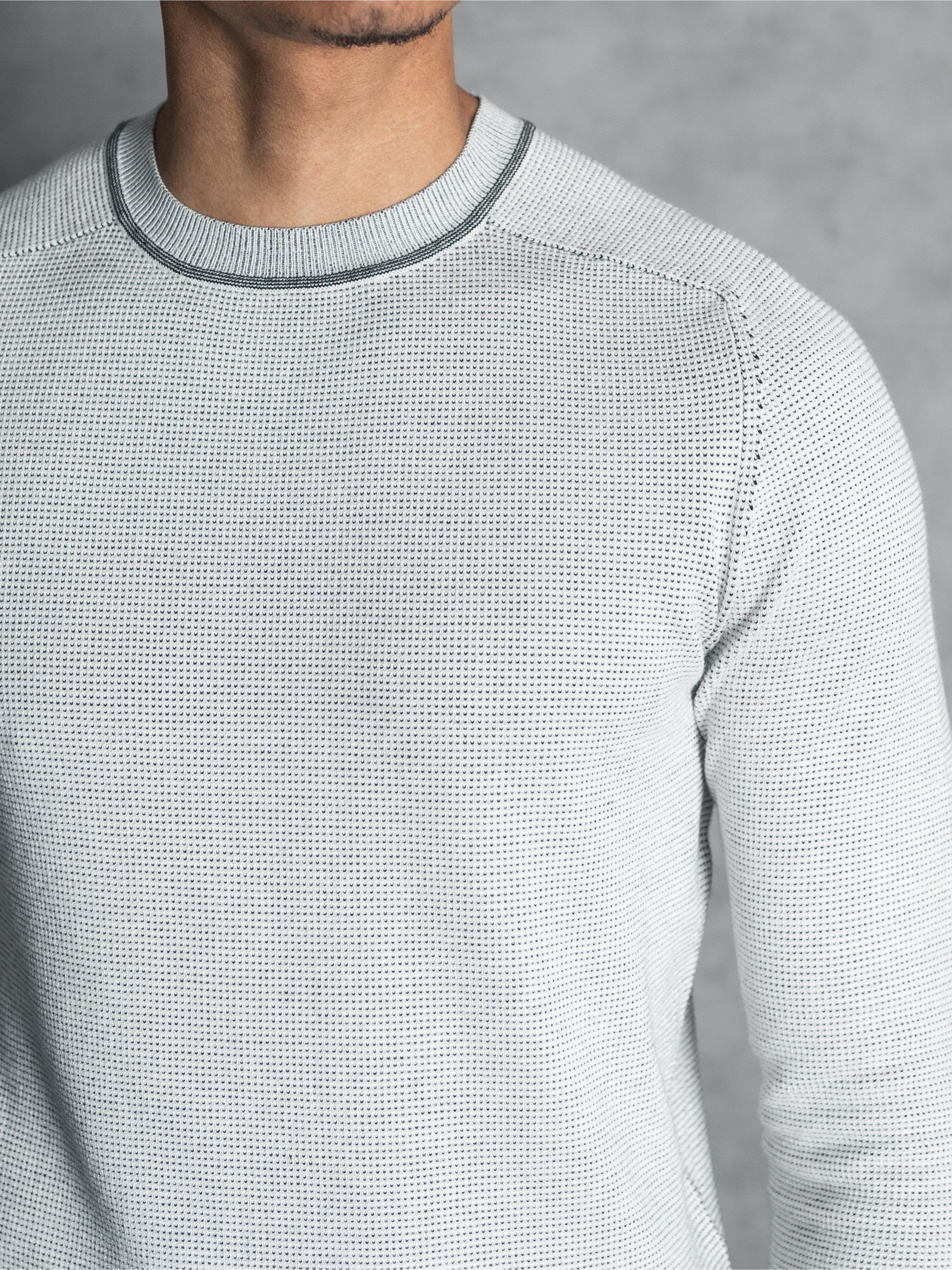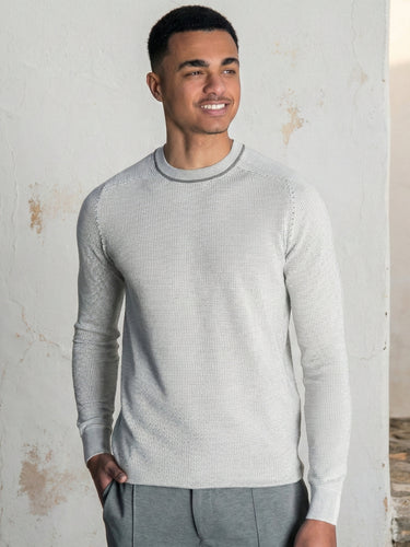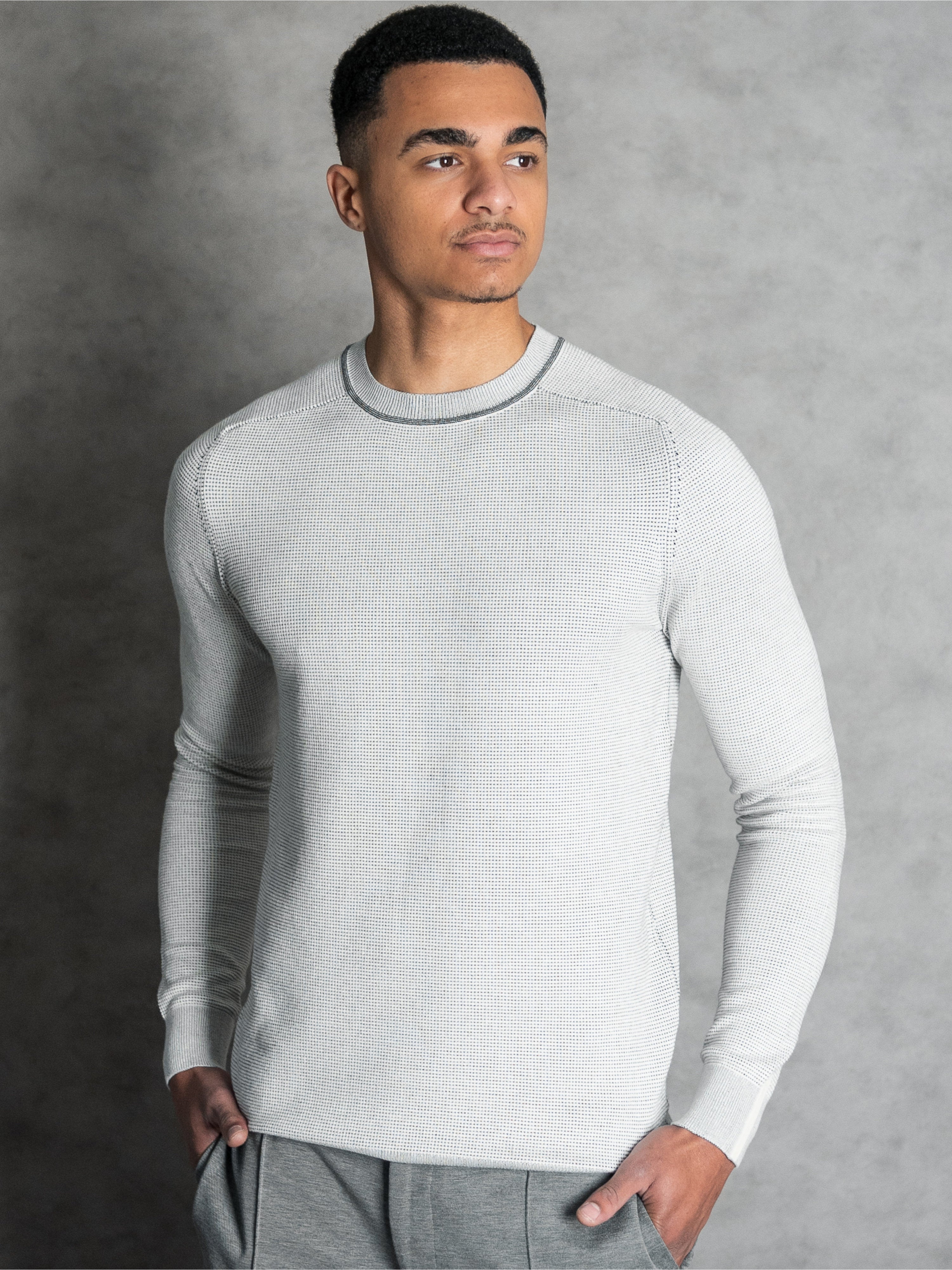 The Skipsby is a modern take on the classic crewneck, featuring a sophisticated two-tone micro-knit pattern. This bird's-eye weave creates a high-end, textured appearance that reveals its intricate detail up close. It is finished with a refined contrast tipping on the neckline and cuffs for a sharp, sporty edge.